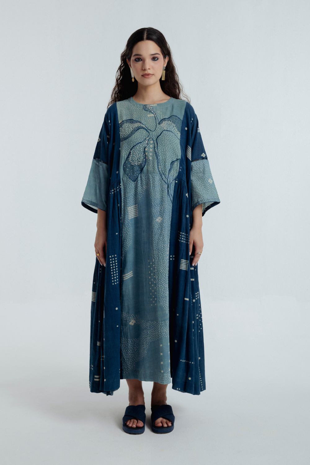 This exquisite dress features fine pleats and panels along the sides. The comfortable upper bodice enhances its elegant shape and falls with perfected volume for graceful movement. Crafted with precision, the bodice is adorned with delicate blue embroidered dots and lines , forming a subtle, organic pattern that is both understated and captivating. The design plays with contrast—light-shaded large motifs along the sides and darker, smaller patterns of dabu at the front—adding depth and visual interest.the dress is lined underneath to give it more defination
