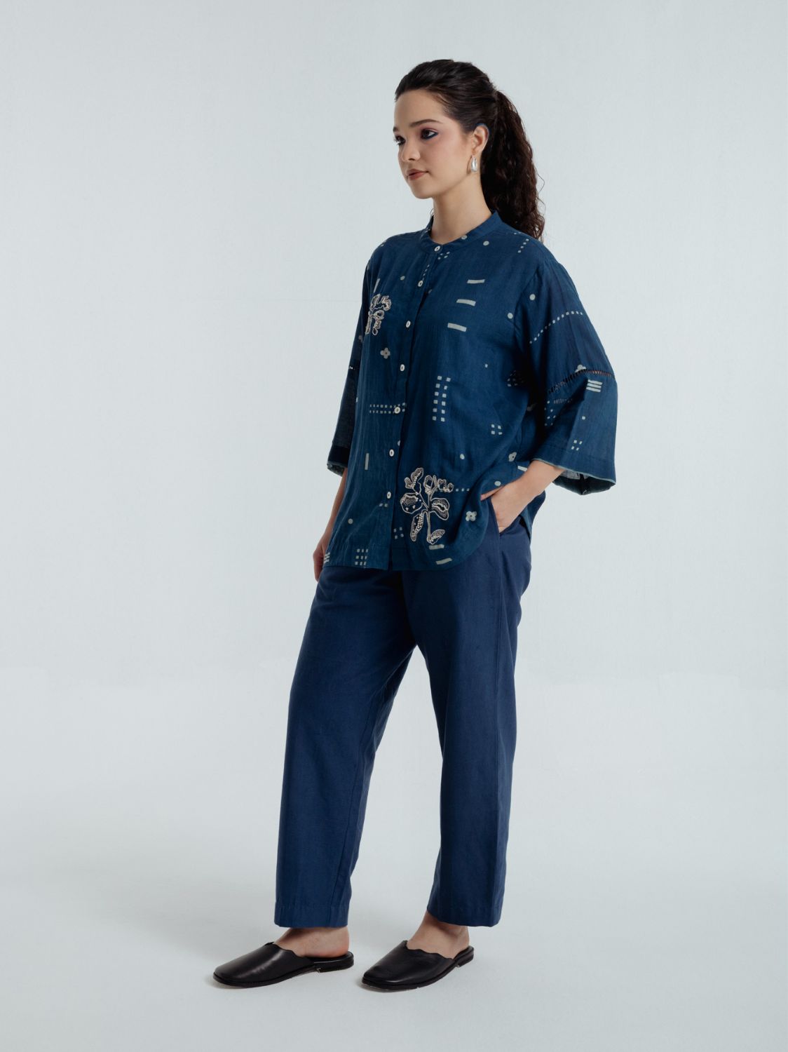 Delicate blue and white hand embroidered french knots making dots and lines, arranged in subtle organic motifs, add a quiet charm, while big Dabbu patterns create depth and engineered placement. Two embroidered motifs grace either side of the shirt, and natural shell buttons provide a refined finishing touch.