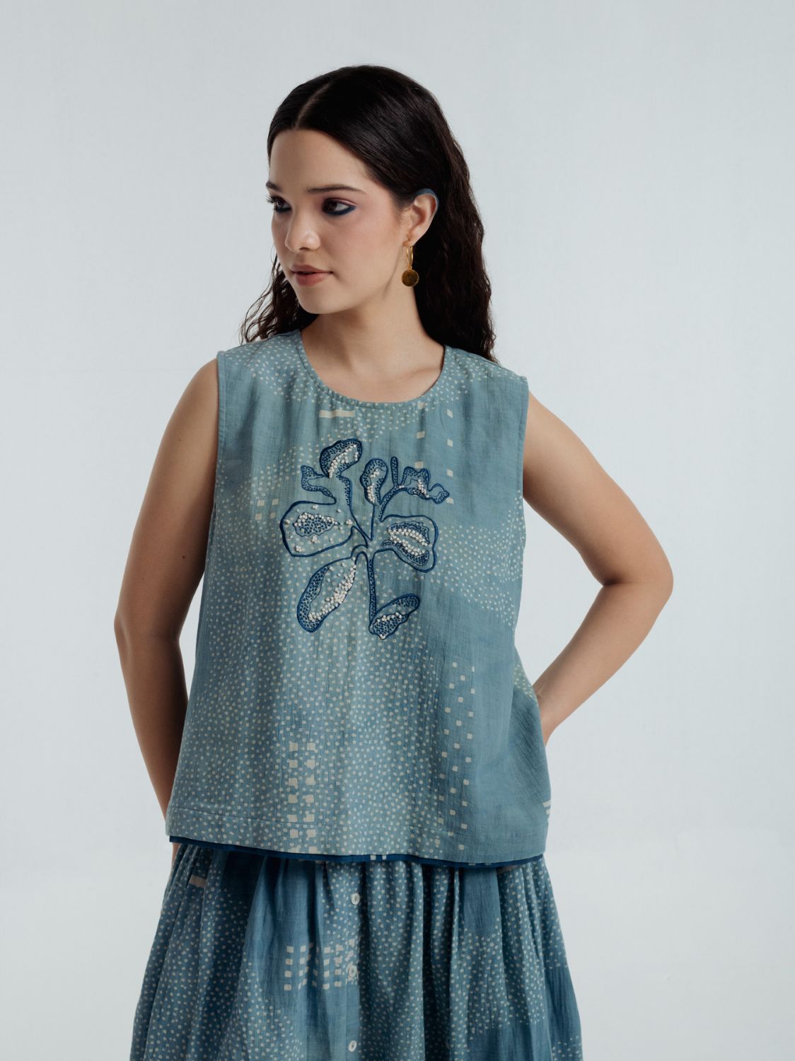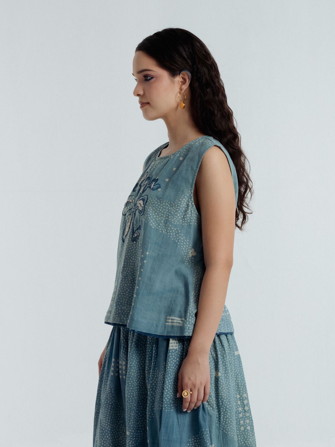 This exquisite top is adorned with Bagru’s traditional Dabbu mud-resist prints and intricate embroidery, a harmonious blend of craftsmanship and elegance. The relaxed silhouette drapes with effortless grace, flattering the figure ensuring all-day comfort. From brunch gatherings to garden walks and softly lit evenings, it moves with you through the day.