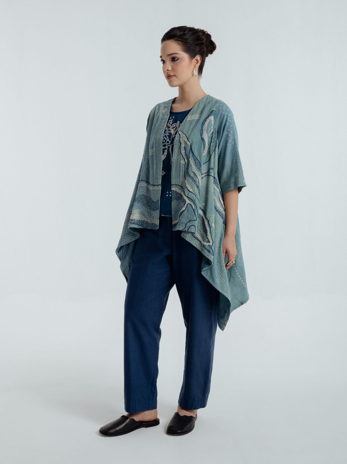 Delicate blue and white French knots, hand-embroidered into dots and lines , form subtle, organic motifs that add a quiet, poetic charm. Bold Dabbu patterns bring depth through engineered placement, while detailing makes the ensemble versatile enough to move from casual day moments to elegant evening gatherings.