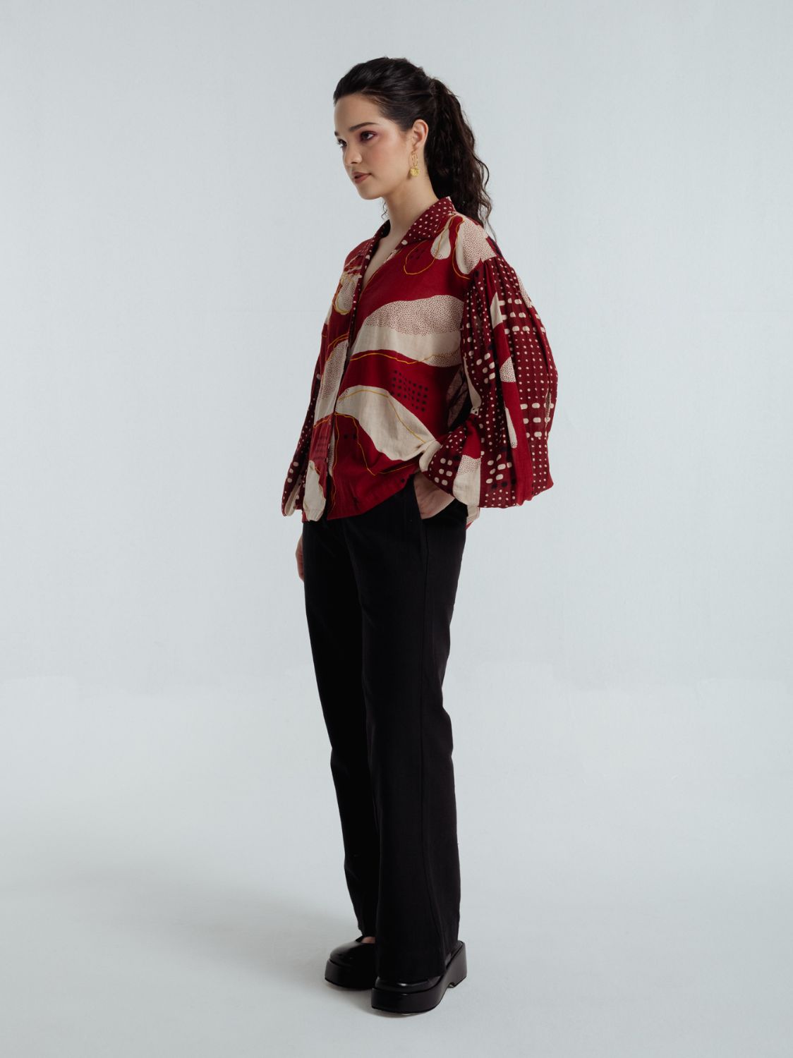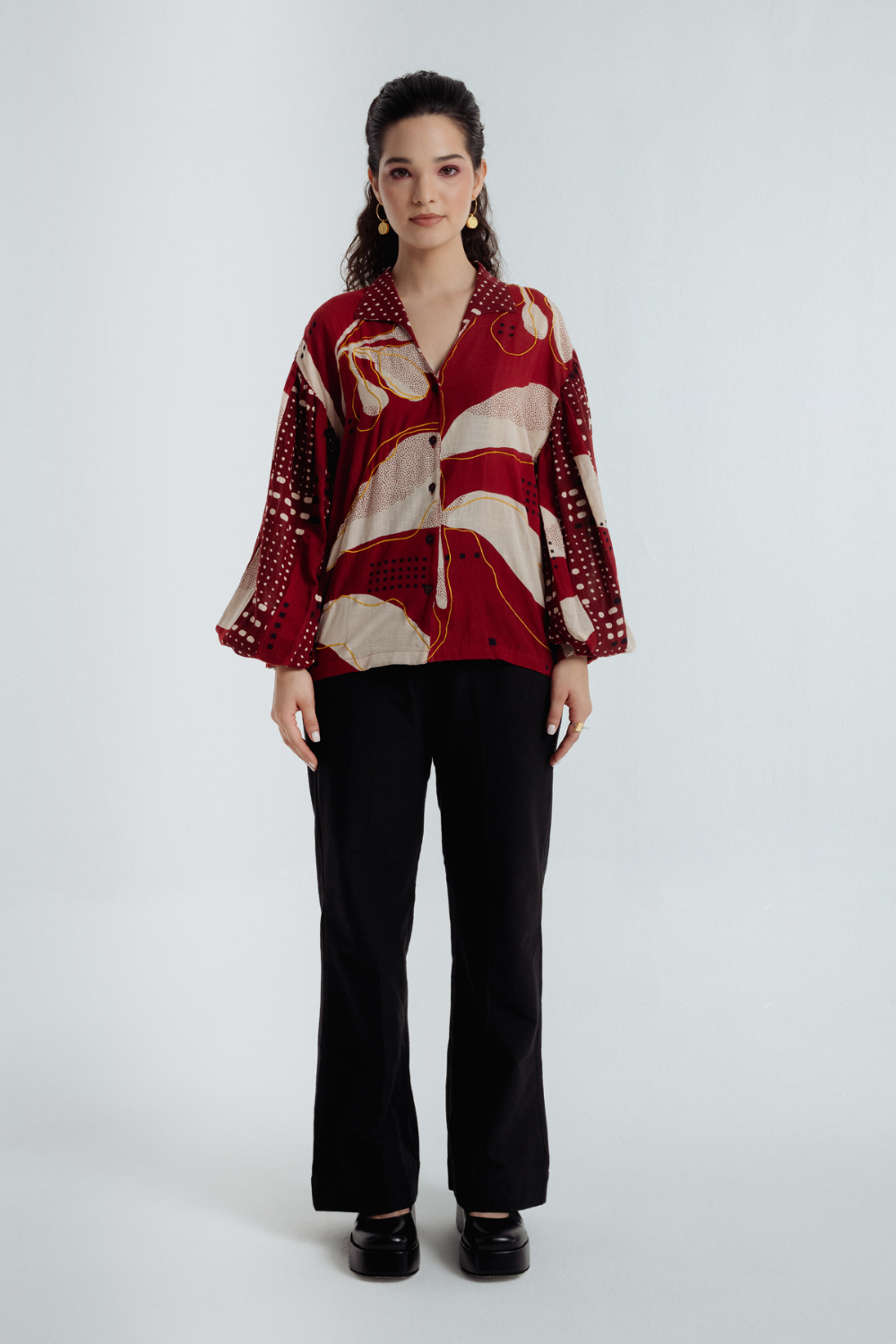 Designed for a comfortable fit, the shirt has elevated sleeves with two distinct paneled patterns that enhance the graceful fall. It is finished with a classic shirt collar and a button-down front, fastened with shell buttons for a refined touch.