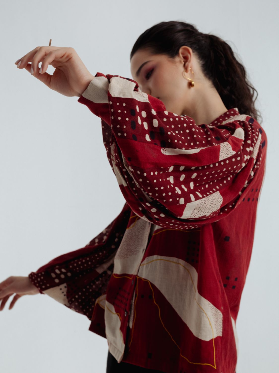 This beautiful shirt features voluminous balloon drop sleeves that create an elegant, flowing silhouette.Crafted with meticulous precision, the fabric is adorned with mustard-hued machine-embroidered lines, forming a subtle, organic pattern that feels both delicate and captivating.