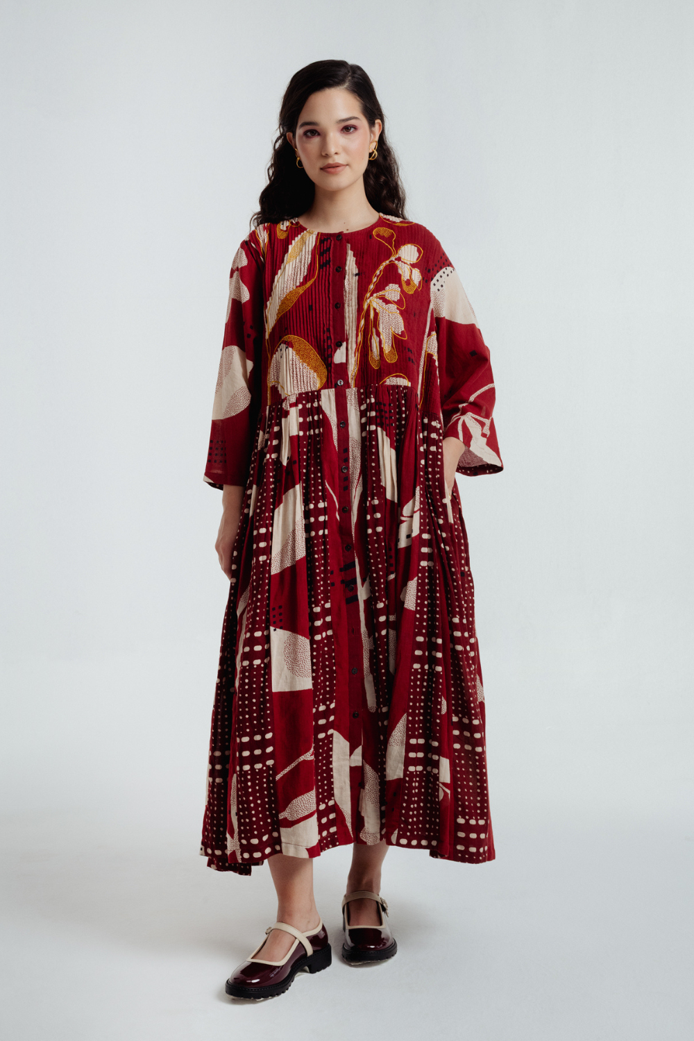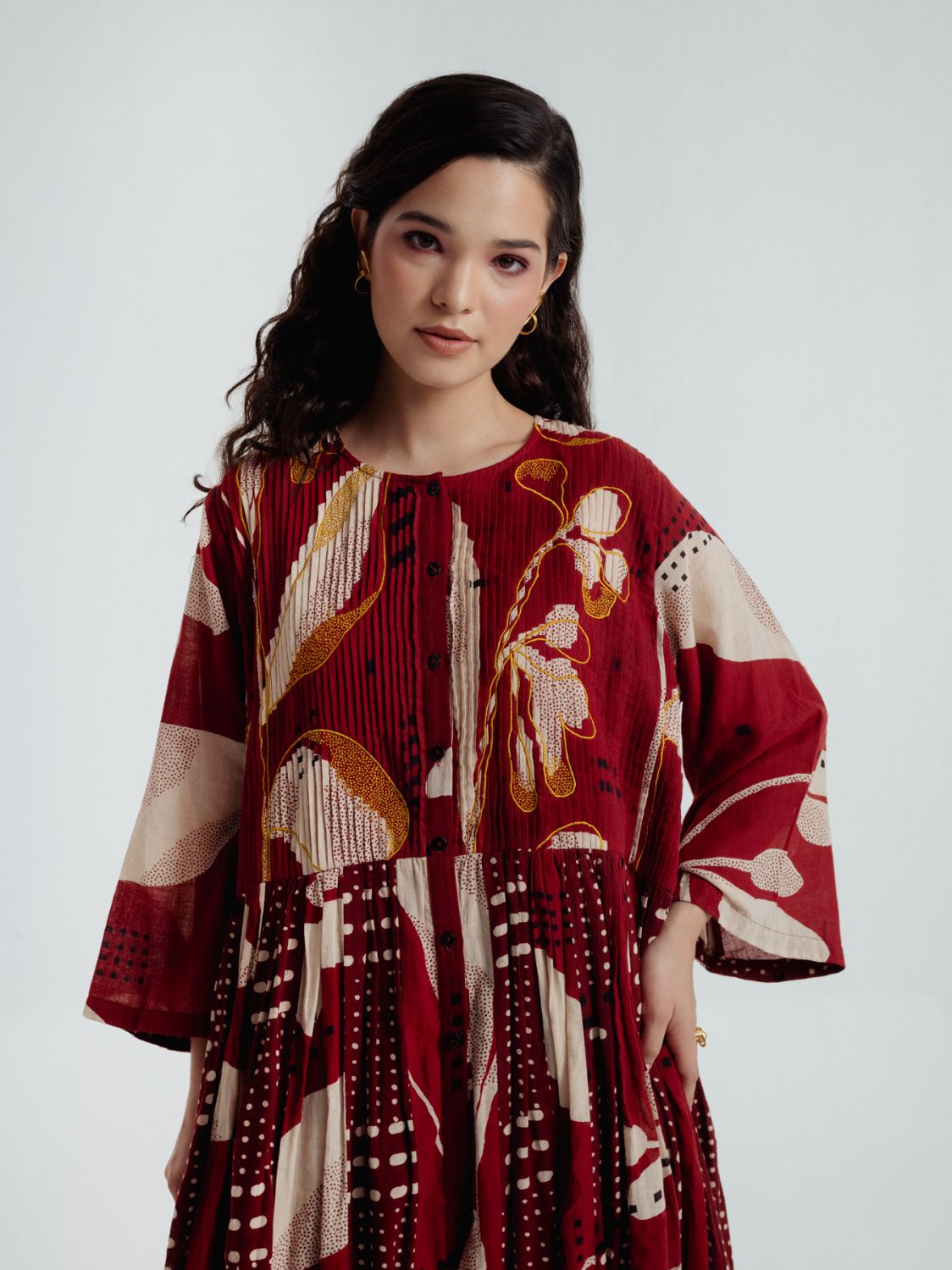Finished with Bagru’s Dabbu mud-resist prints and intricate embroidery, these silhouettes blend heritage, patience, and modern elegance—blooming with a quiet magic.This two-piece set pairs a sleeveless cotton slip with a voluminous jacket. The jacket’s bodice is fully pleated with meticulous precision, and detailed with fine mustard machine-embroidered tiny dots, forming a subtle yet enchanting pattern. Cut from 33 individual panels, the design gives the dress an exceptional flow and graceful movement. The craftsmanship ensures that every detail, from stitching to silhouette - reflects a perfect balance of structure and fluidity.