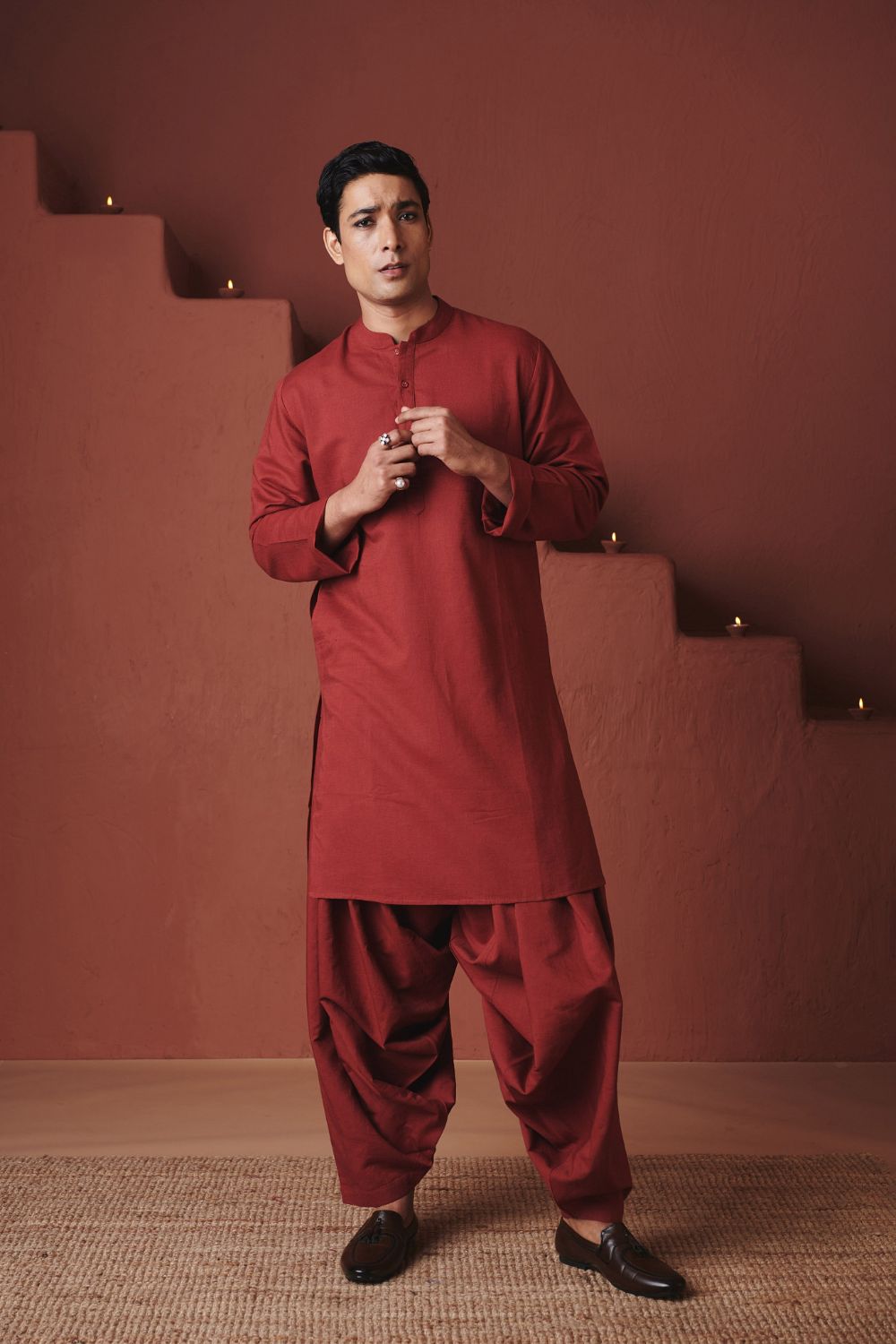 A timeless co-linen kurta set tailored in a straight, structured silhouette with a clean neckline and minimal detailing. Paired with comfortable trousers or a dhoti, it offers versatility to move from festive occasions to everyday wear, bringing understated elegance in jewel tones and natural textures.