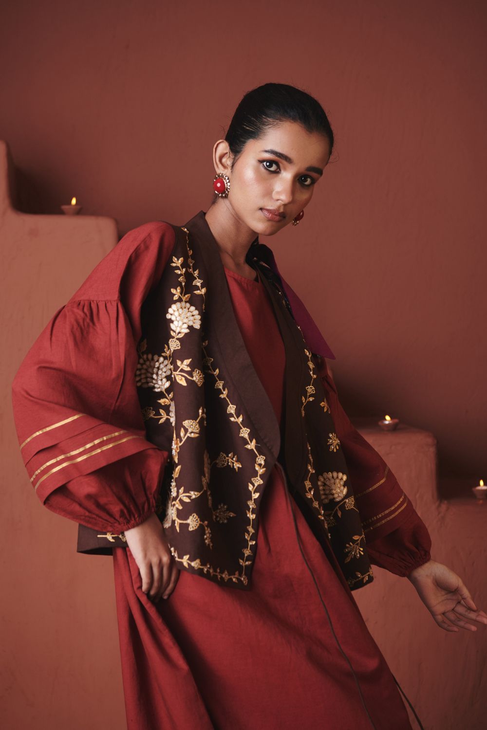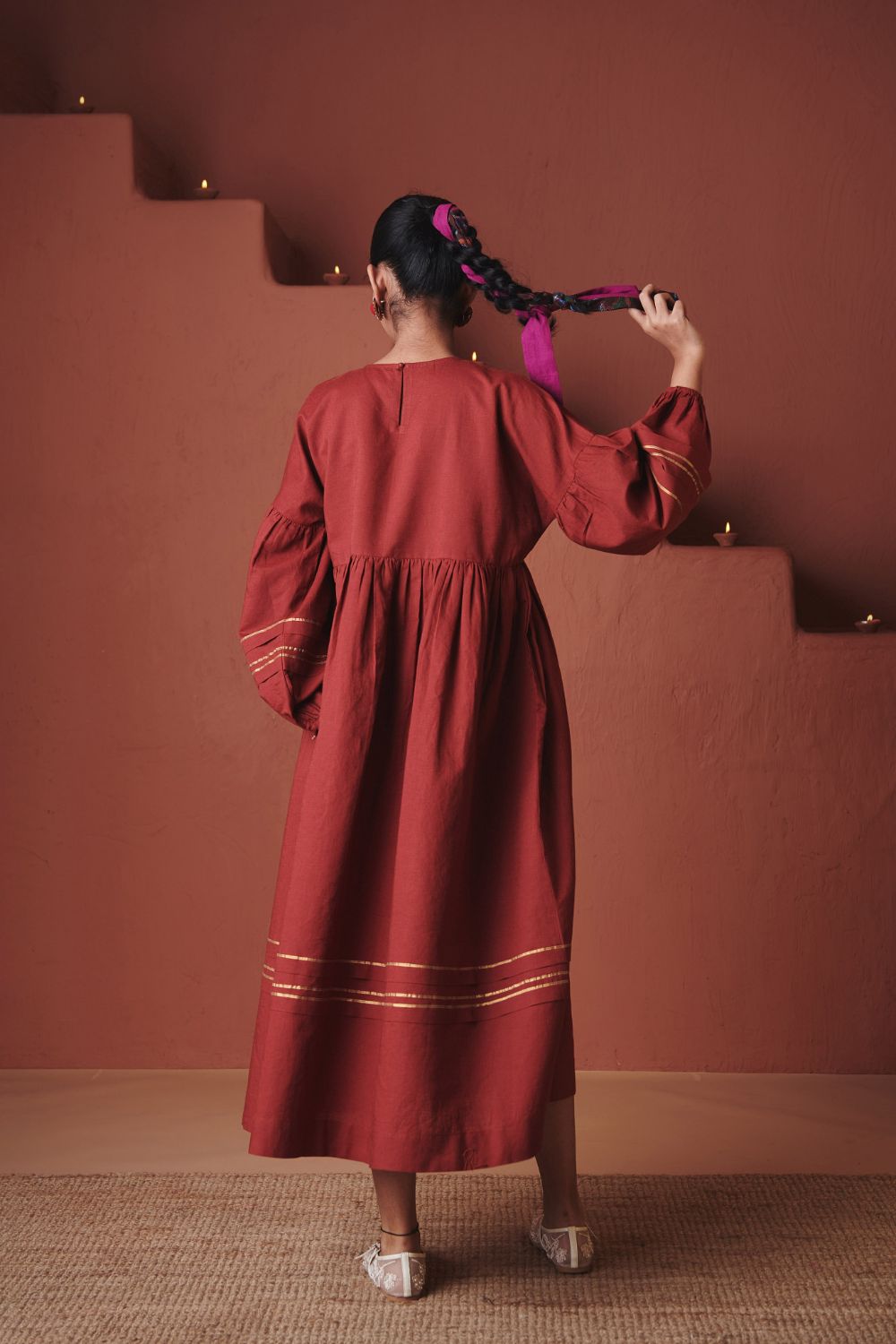 A co-linen sack dress designed with a loose, easy silhouette that falls away from the body for effortless comfort. Finished with gathered balloon sleeves and gota-detailed borders at the cuff and hem, it combines relaxed volume with subtle festive accents, making it a versatile piece for both day and evening wear.