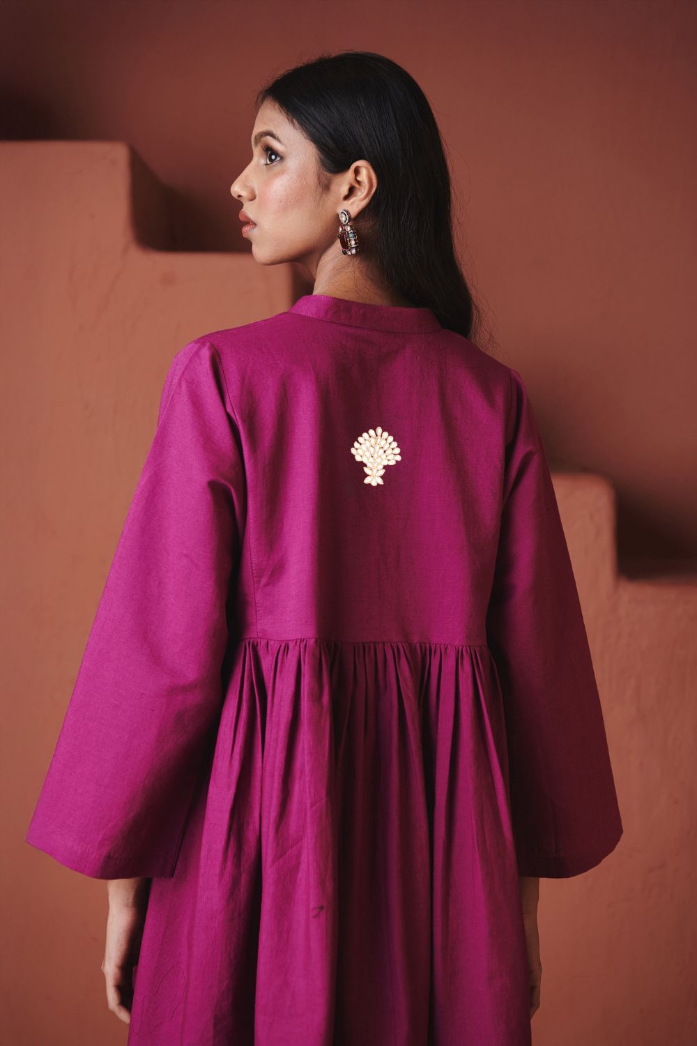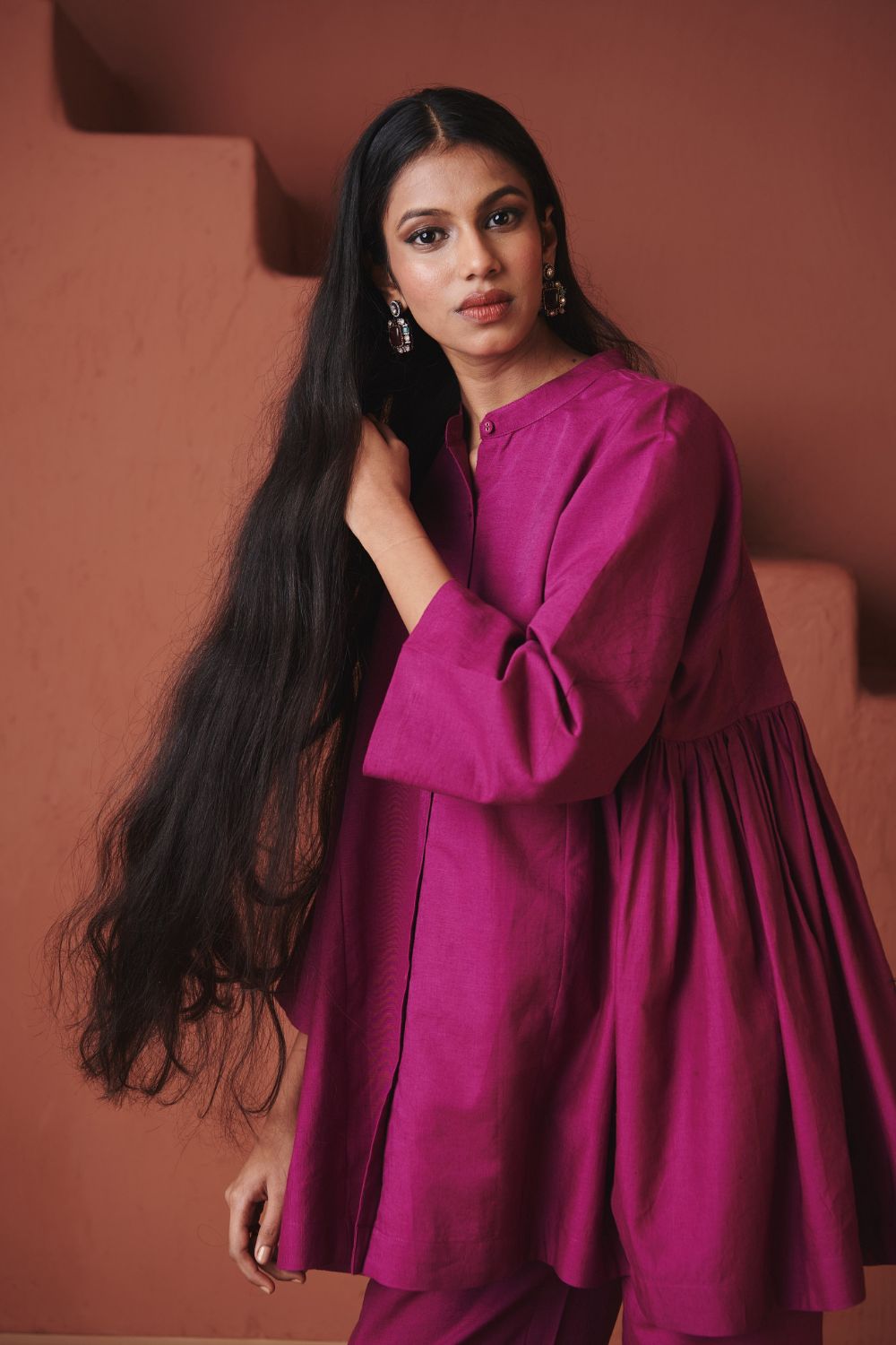 A co-linen gathered shirt set featuring a relaxed button-down top with soft gathers falling from the waistline for added volume and ease. The back is detailed with a single embroidered motif, lending a festive accent to its otherwise minimal structure. Paired with straight pants, it balances comfort and refinement in equal measure.