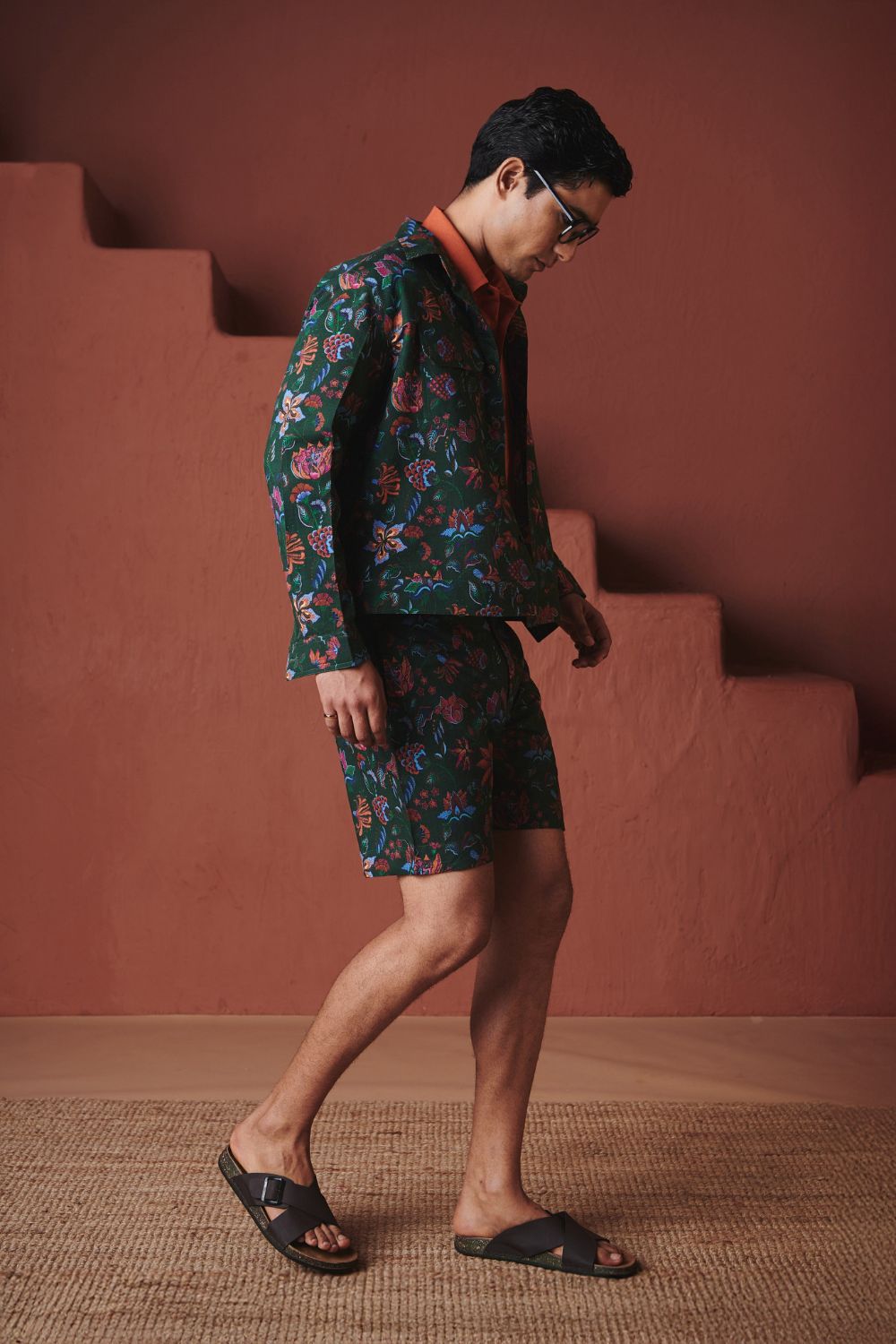 A relaxed half-sleeve shirt cut from pure linen, designed with utility-inspired flap pockets and a classic collar. Lightweight yet structured, it blends everyday ease with a touch of retro sharpness, ideal for both casual wear and festive layering.