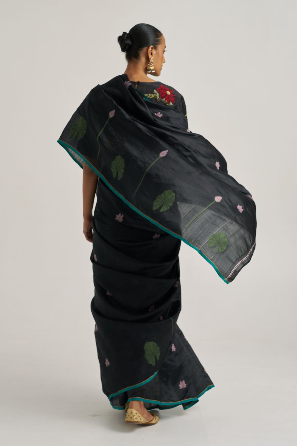 A Black Handwoven Mulberry Silk Sari Detailed With Lotus Eaf And Bud Jamdani Motifs Along Blue Selvdge Border And Small Lotus Jamdani Motifs On The Sari.