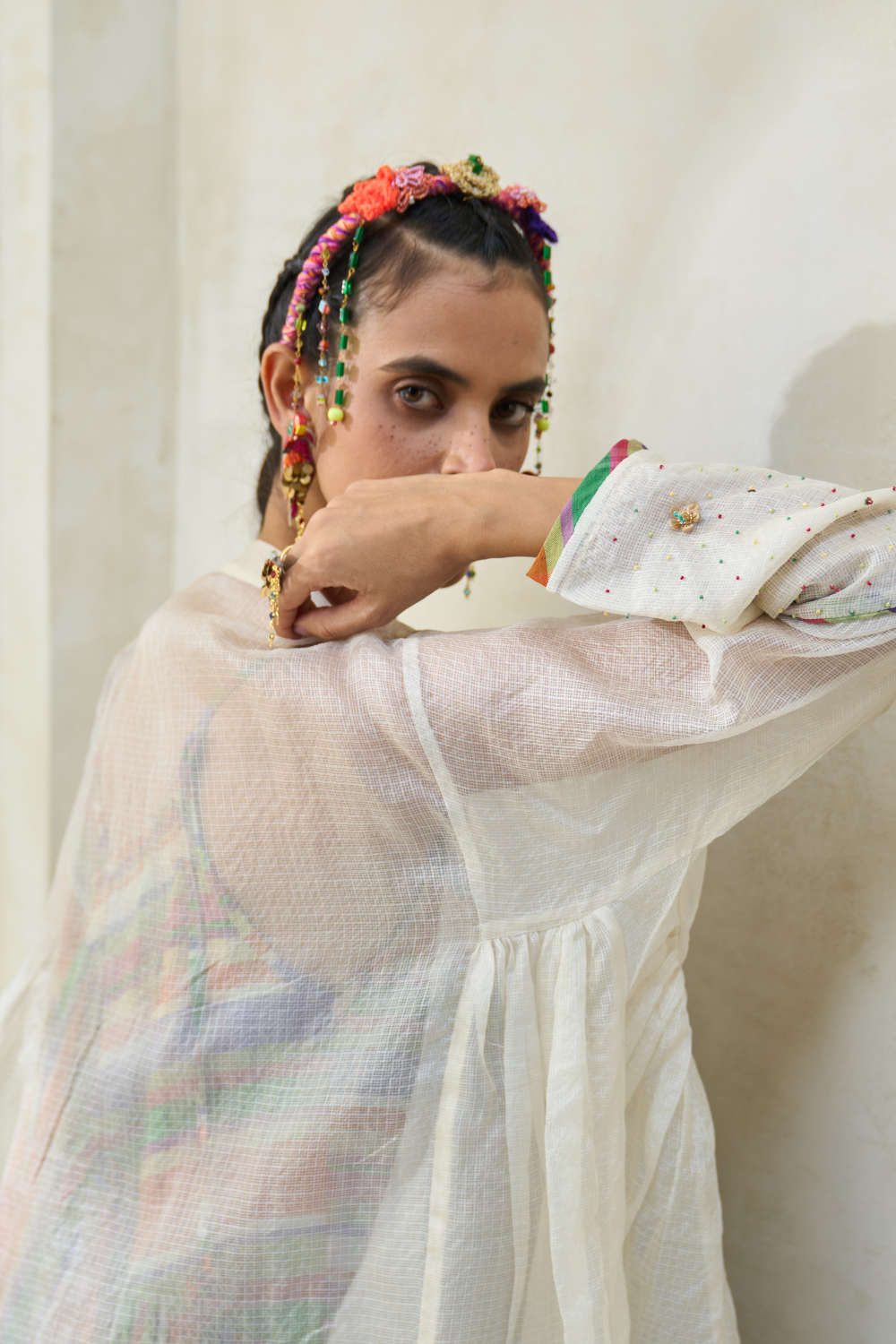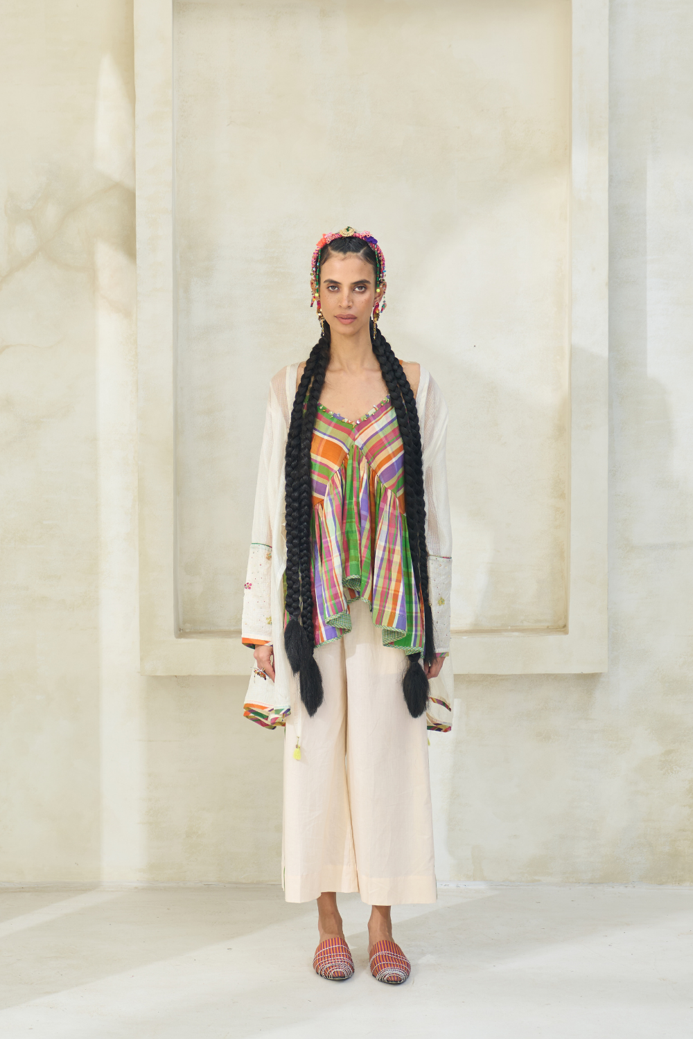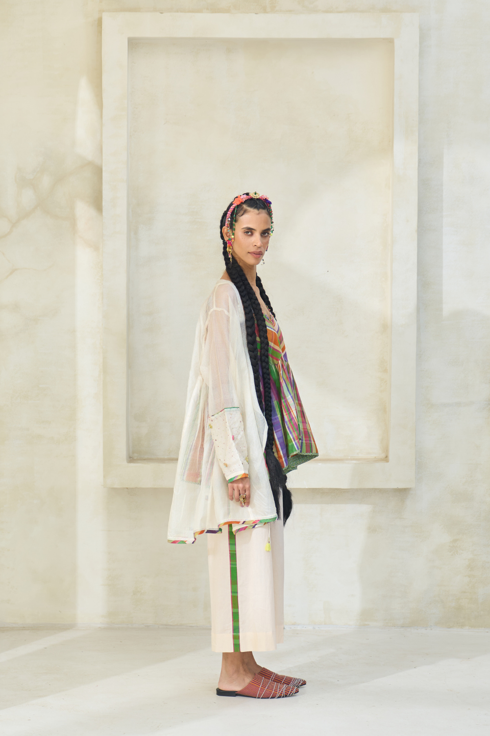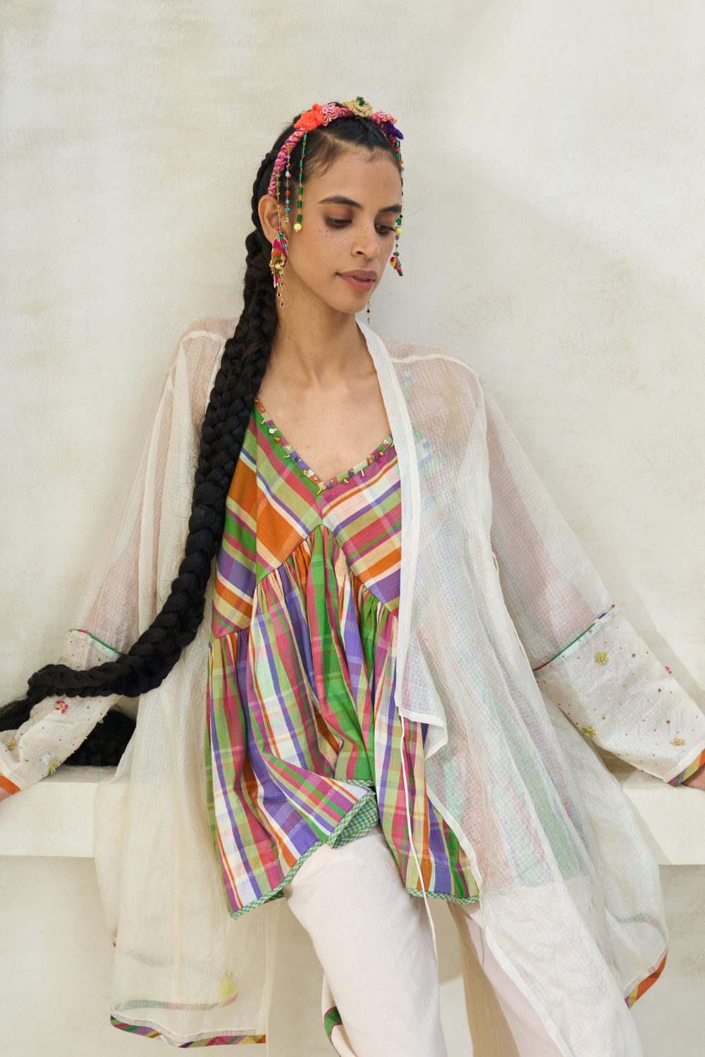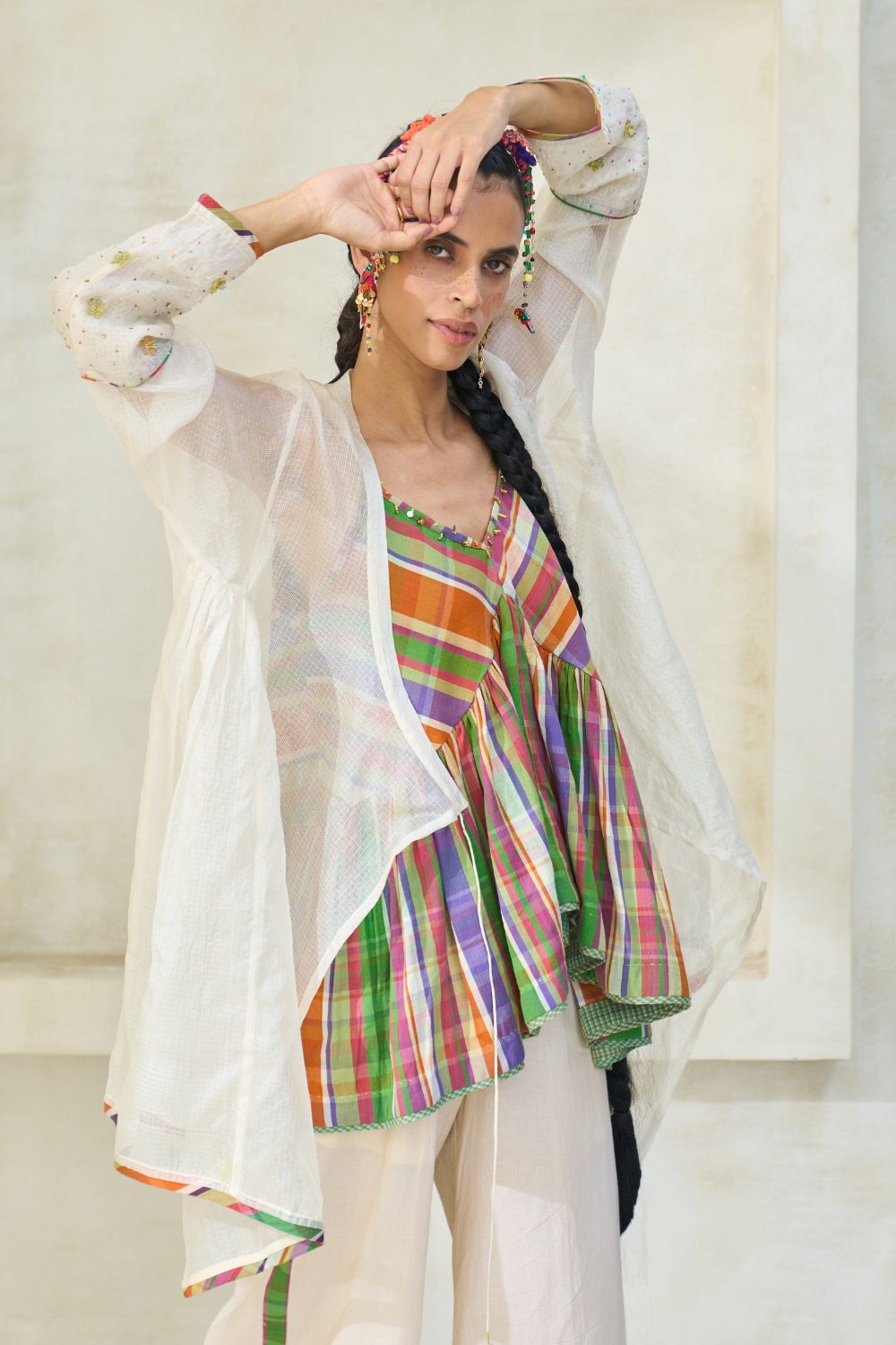 Oversized wrap overlay in handwoven Kota silk, with yarn-dyed Bengal cotton in irregular multicolor check detailing. Finished with multicolor check piping, hand-embroidered cuffs, and tassel detailing.