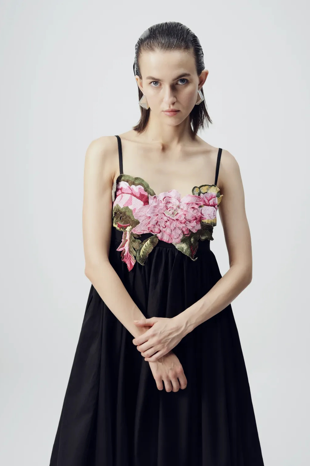 Opt for sleek hair or a low bun to highlight the embroidered bodice.