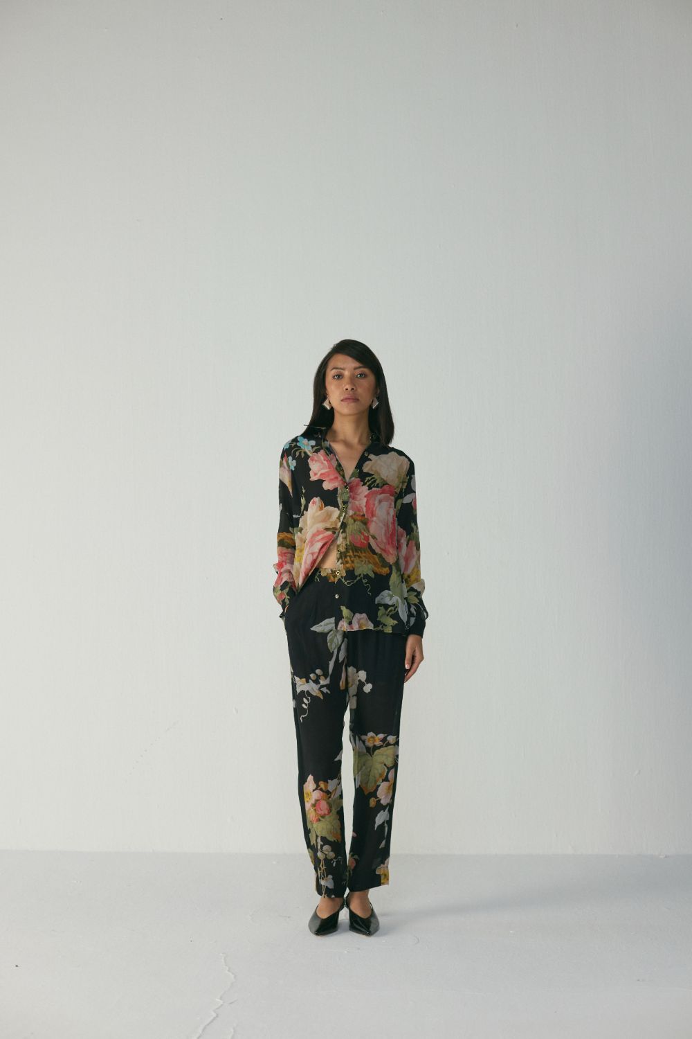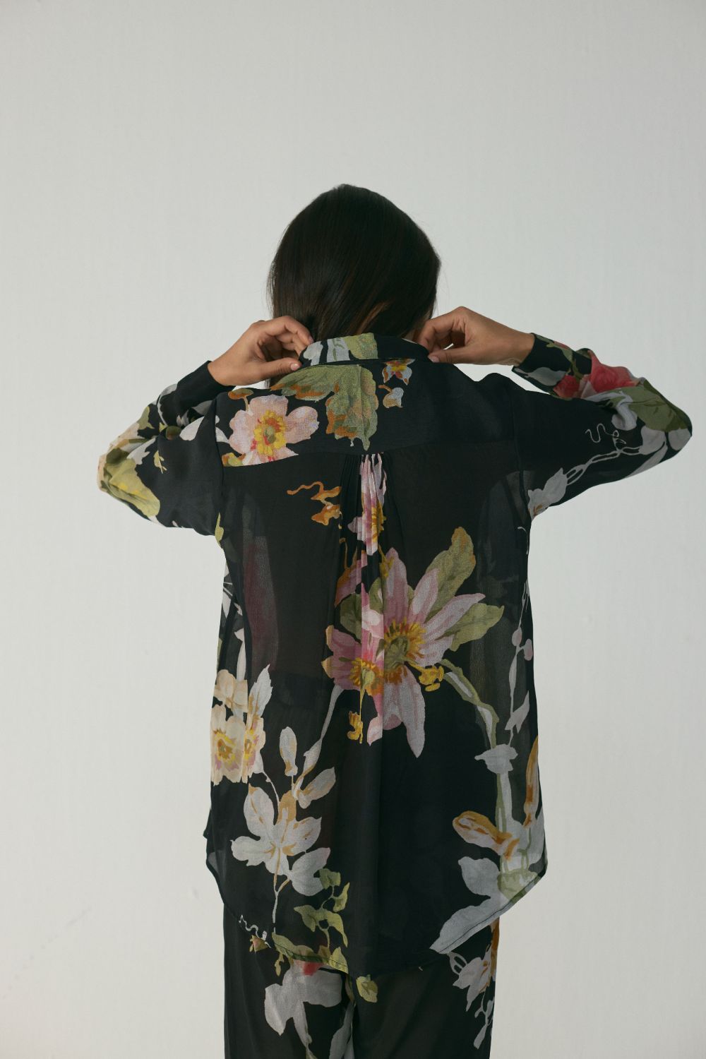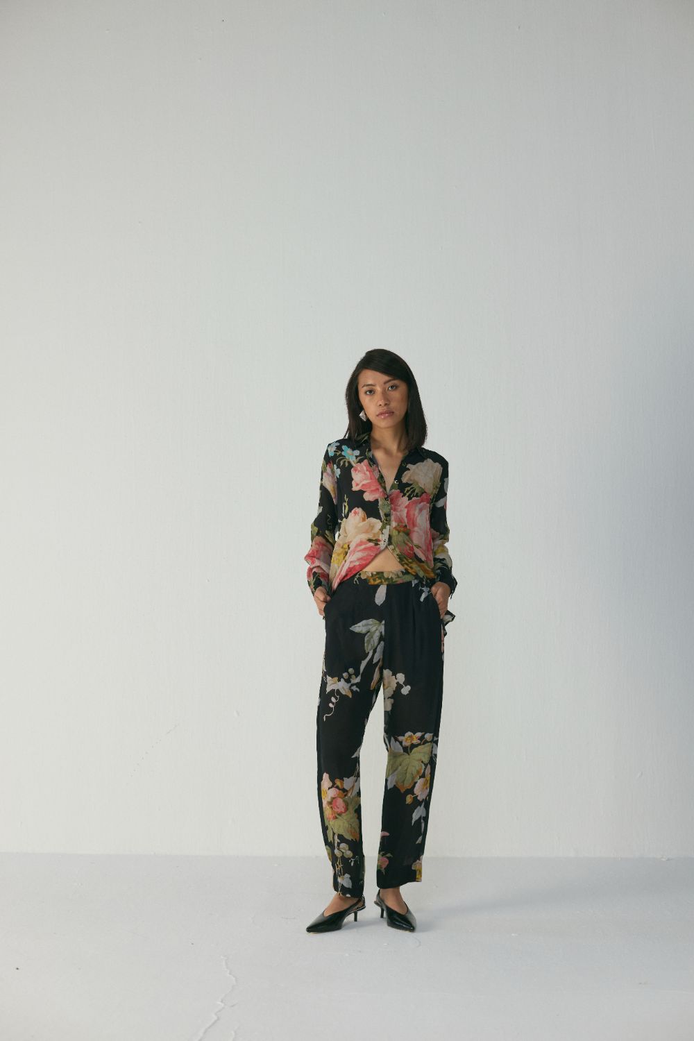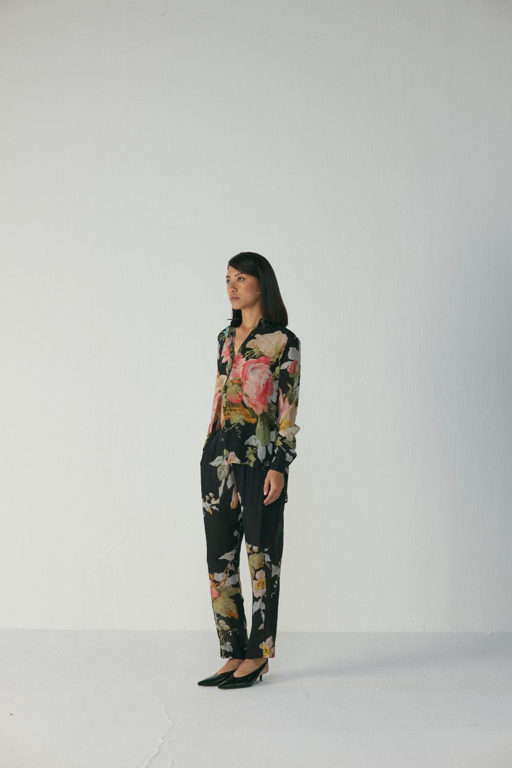 Elevate your wardrobe with this co-ord Set, a fluid and effortlessly sophisticated ensemble crafted for modern elegance. The relaxed-fit button-down shirt features a sheer, airy drape that showcases the rich floral artwork—soft pinks, greens, and creams blooming over a deep black base. Paired with matching straight-leg trousers, the set creates a harmonious silhouette that feels both luxurious and comfortably understated.