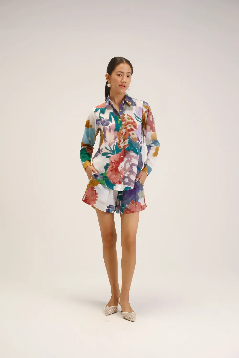 The Farah White Shirt & Shorts Set radiant blend of comfort and artistry. Featuring an abstract floral print that mimics the fluidity of watercolours, this ensemble celebrates painterly textures and vibrant hues like lilac, ochre, teal, rust, and violet on a soft ivory base.