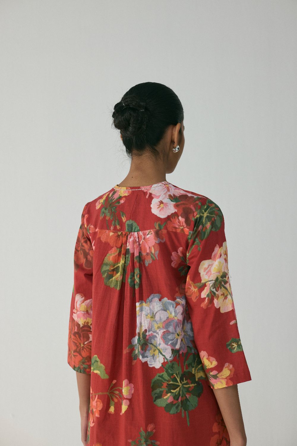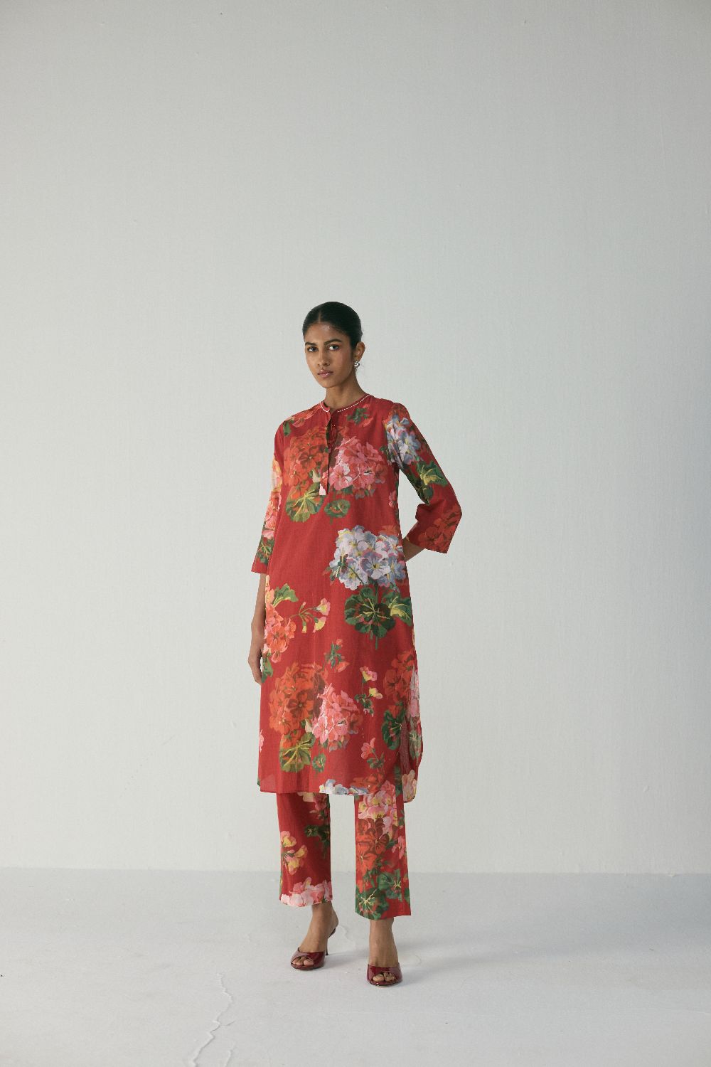 A vibrant ode to timeless botanical artistry, this print features hand-painted florals in full bloom, rendered in lush shades of crimson, blush pink, lilac, and verdant green. Set against a rich red base, the cascading flowers create a romantic yet contemporary expression, blending vintage elegance with modern sophistication. The placement of the florals is thoughtfully balanced, giving the ensemble a refined, painterly charm that stands out effortlessly.