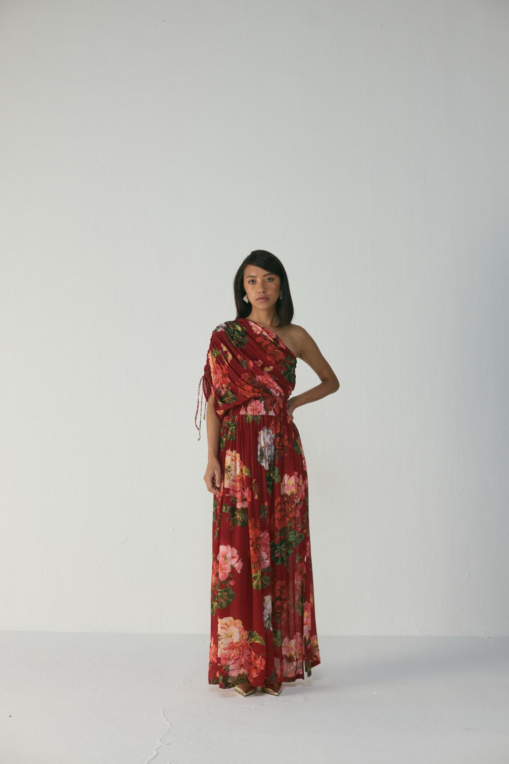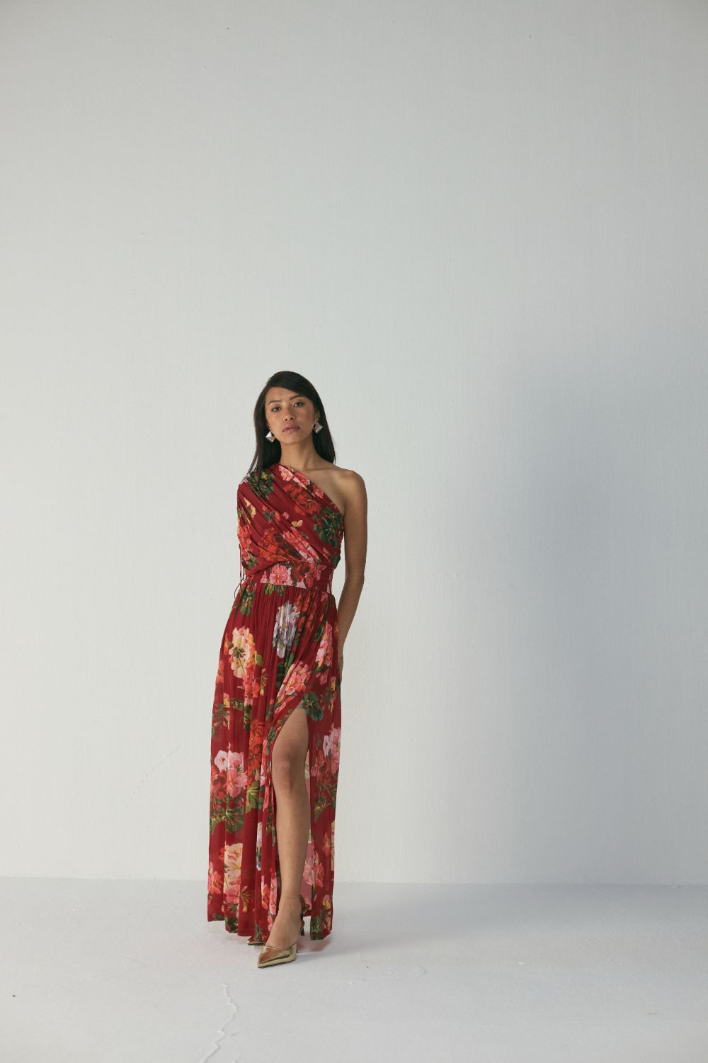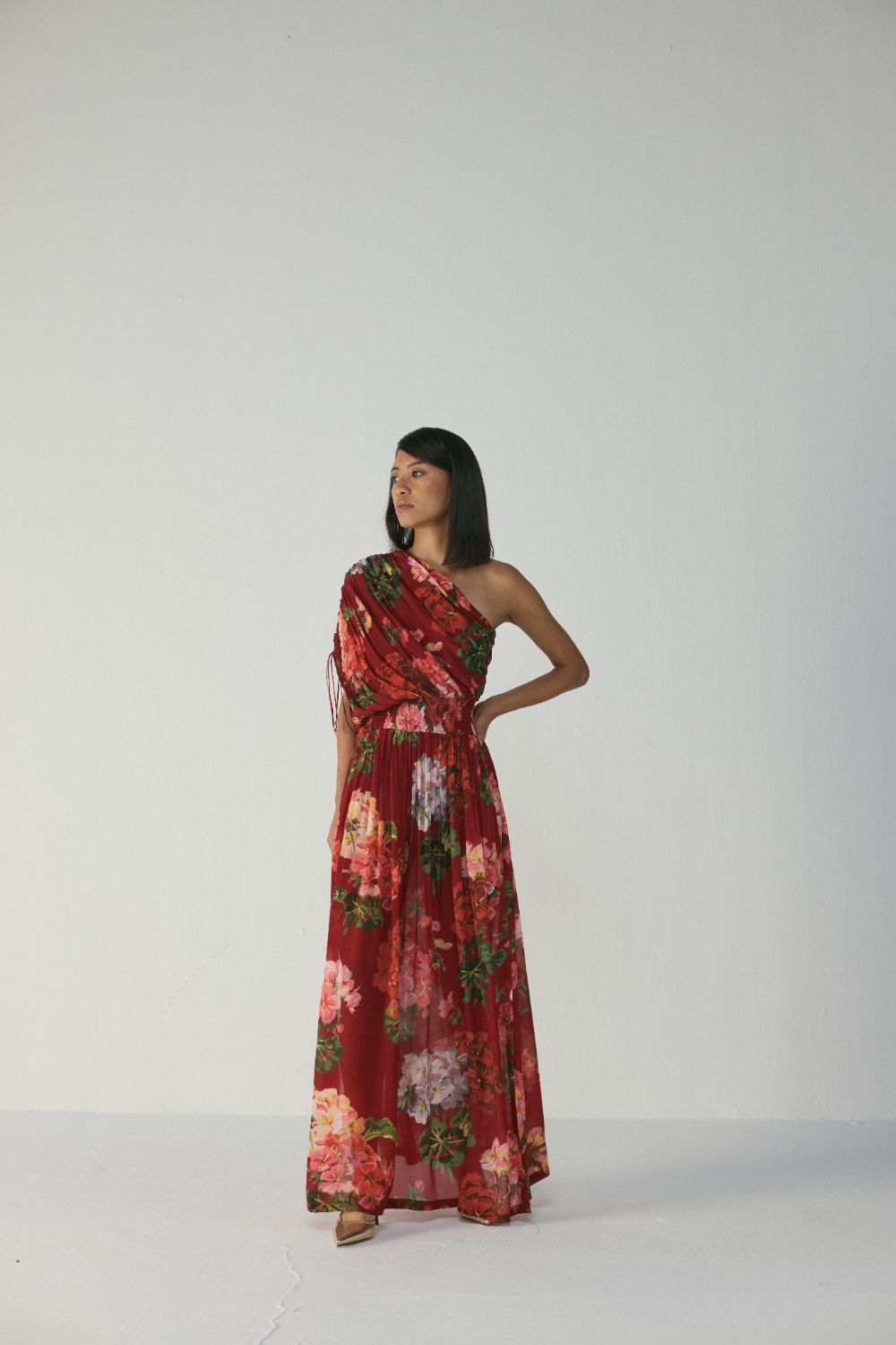 This is a one-shoulder, floor-length dress designed to make an elegant statement. The dress showcases a beautifully draped, ruched bodice that wraps across one shoulder, creating soft volume and an elevated sculptural look. The waist is gathered to define the silhouette before transitioning into a long, flowing skirt that moves gracefully. The combination of asymmetric design, rich florals, and airy fabric lends the gown a refined yet effortless charm—perfect for formal occasions, evening events, vacations, or festive celebrations.