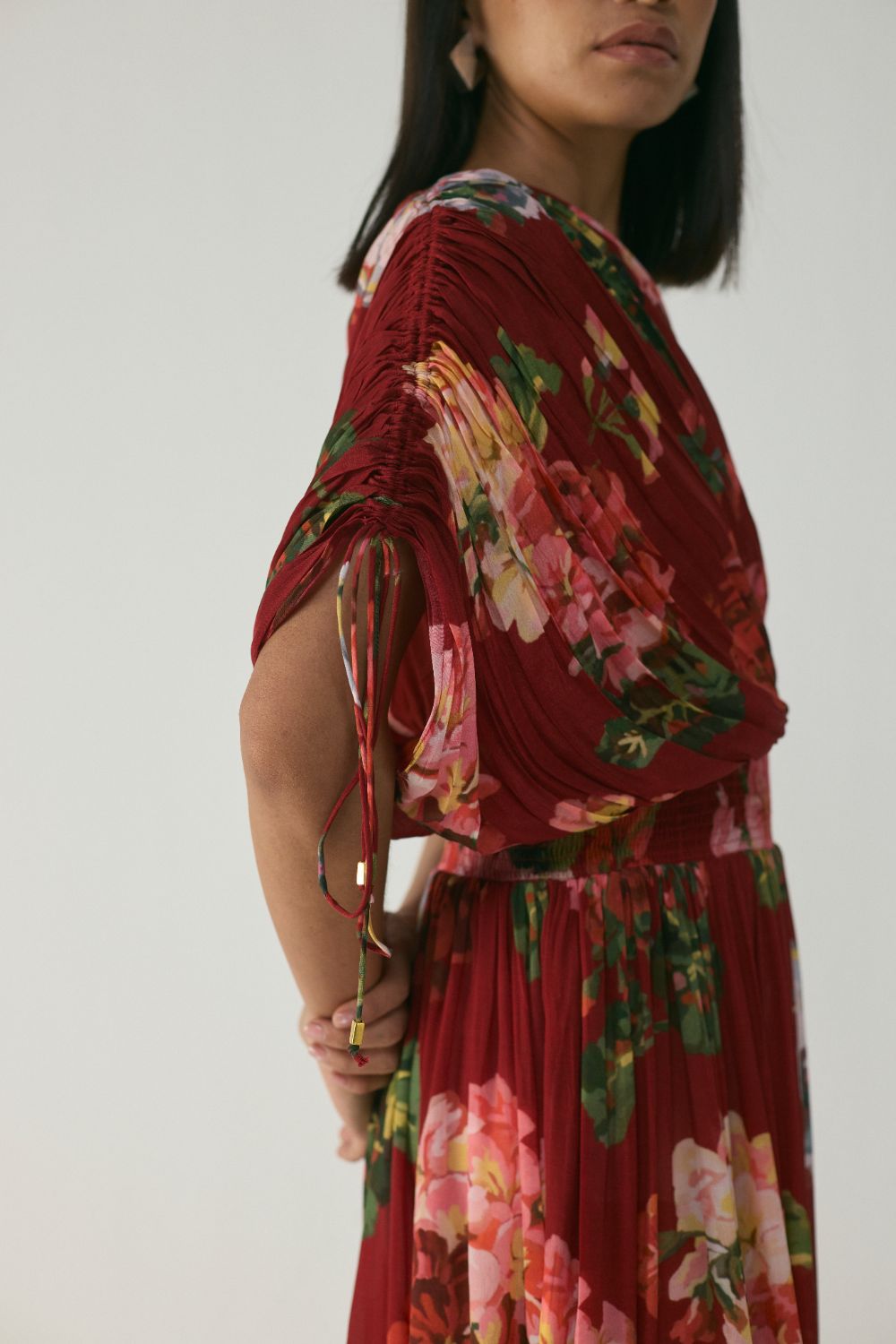 The garment features a lush, painterly floral print set against a rich crimson-red base. Large, romantic blooms in tones of coral, blush pink, lilac, and soft green create a vivid botanical aesthetic. The print distributes organically across the fabric, adding movement and depth while maintaining a luxurious, garden-inspired feel.
