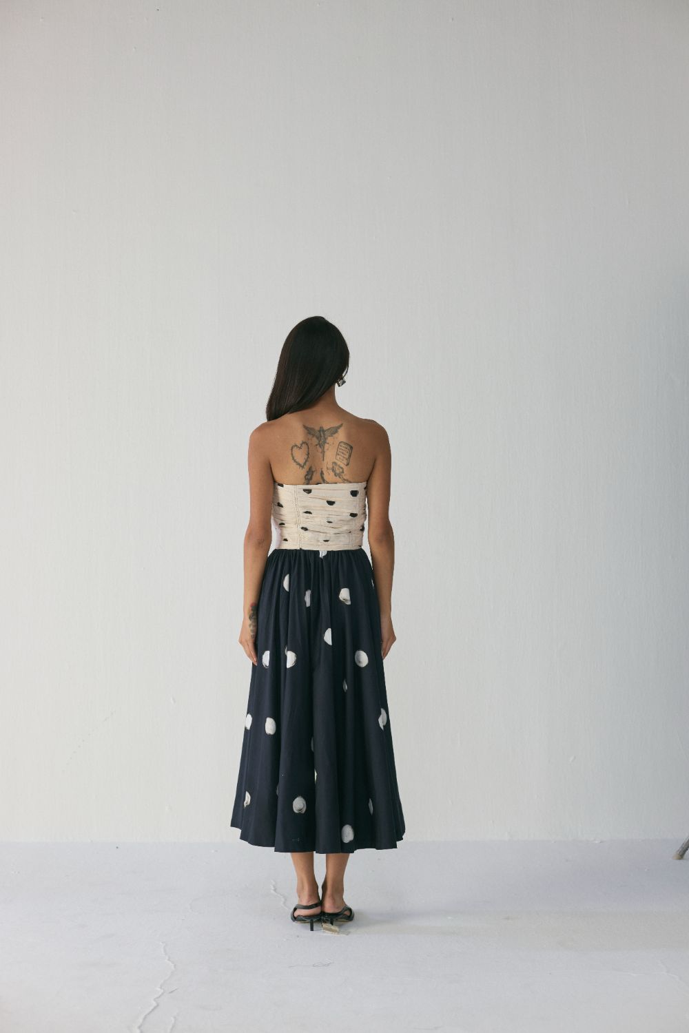 Effortlessly elegant and artfully constructed, this strapless mixed-print midi dress blends structure with ease. The ruched bodice gently contours the torso, offering a sculpted look while maintaining comfort. From the waist down, the dress releases into a voluminous, airy skirt that moves beautifully with each step. Designed for dinner parties, gallery gatherings, this piece reimagines classic polka dots with a modern, painterly twist.