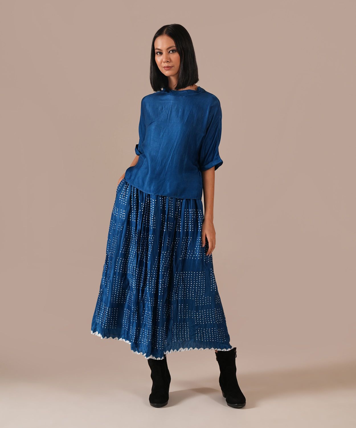 This ensemble is a masterful blend of heritage and contemporary elegance: a gathered silk bandhani skirt with side pockets, a sleek silk boxy top with a versatile Bandhani tie belt. Each piece showcases artisanal craftsmanship, luxurious textures, and effortless sophistication. It is a celebration of India’s rich handloom legacy, now reinterpreted for the modern wardrobe.