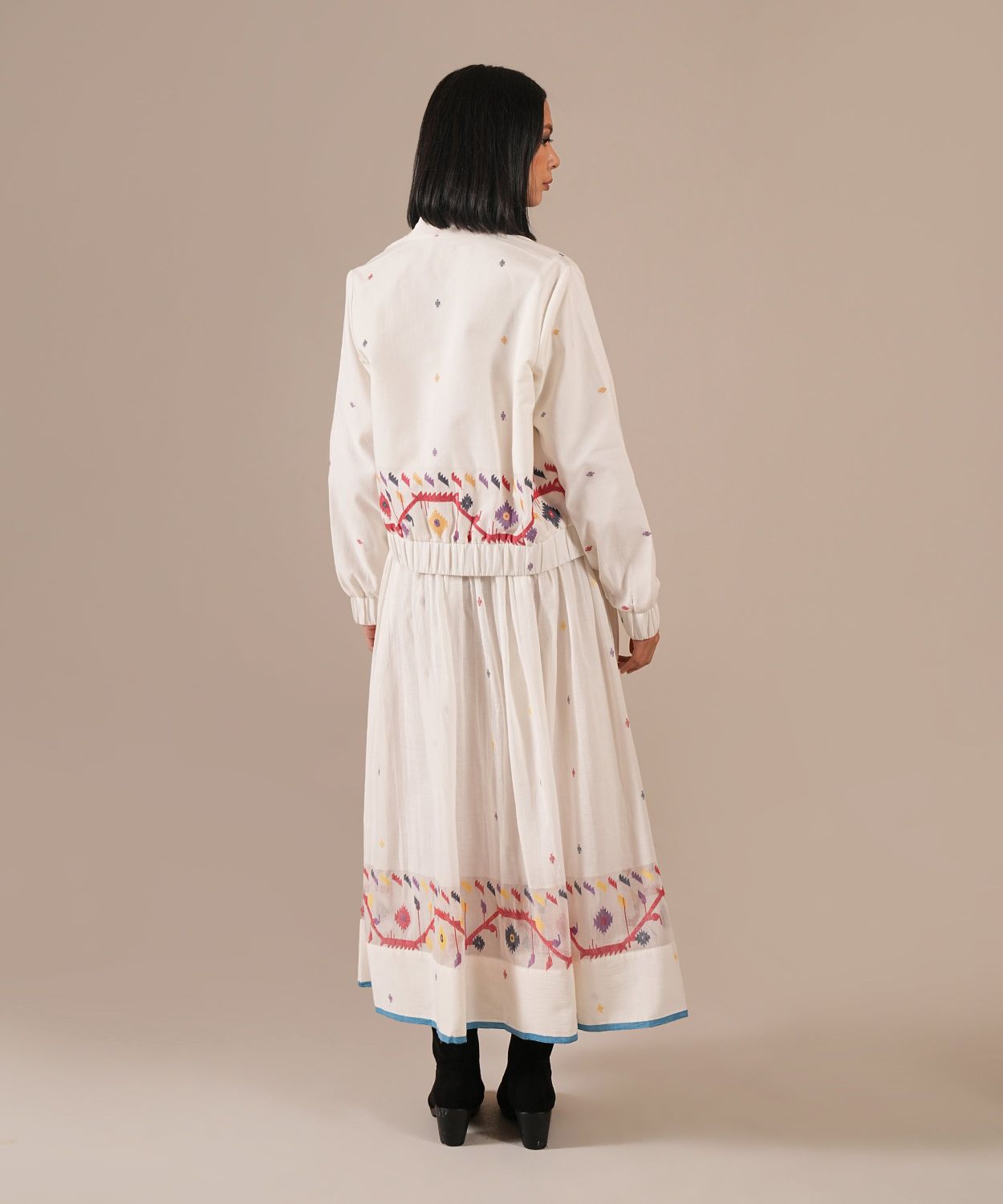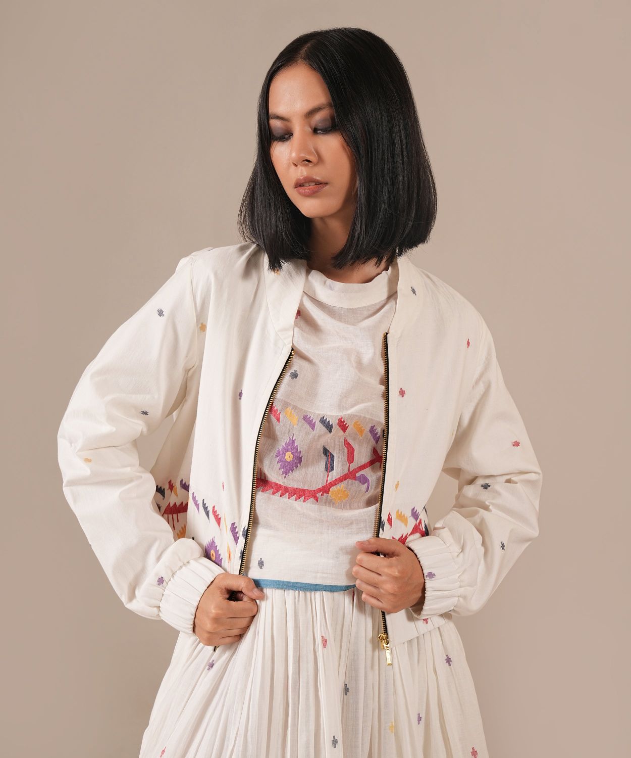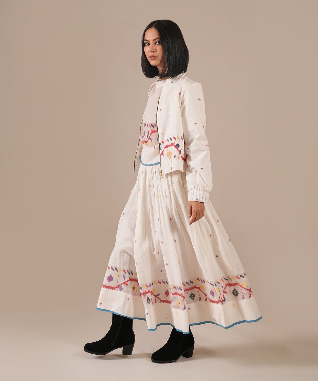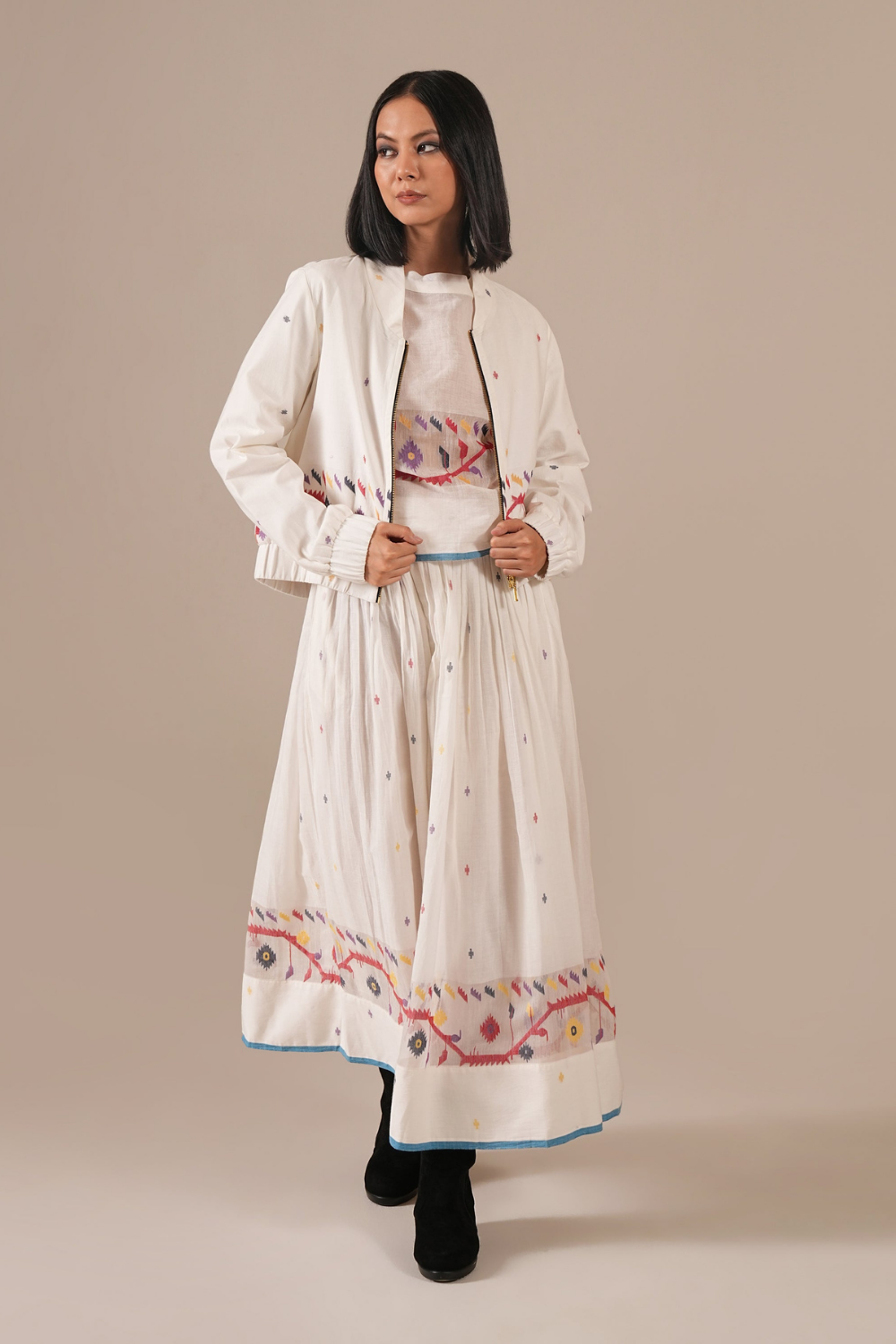 A classic Jamdani co-ord set featuring a boxy top, a gathered skirt, and a versatile bomber jacket designed to be styled in multiple ways.