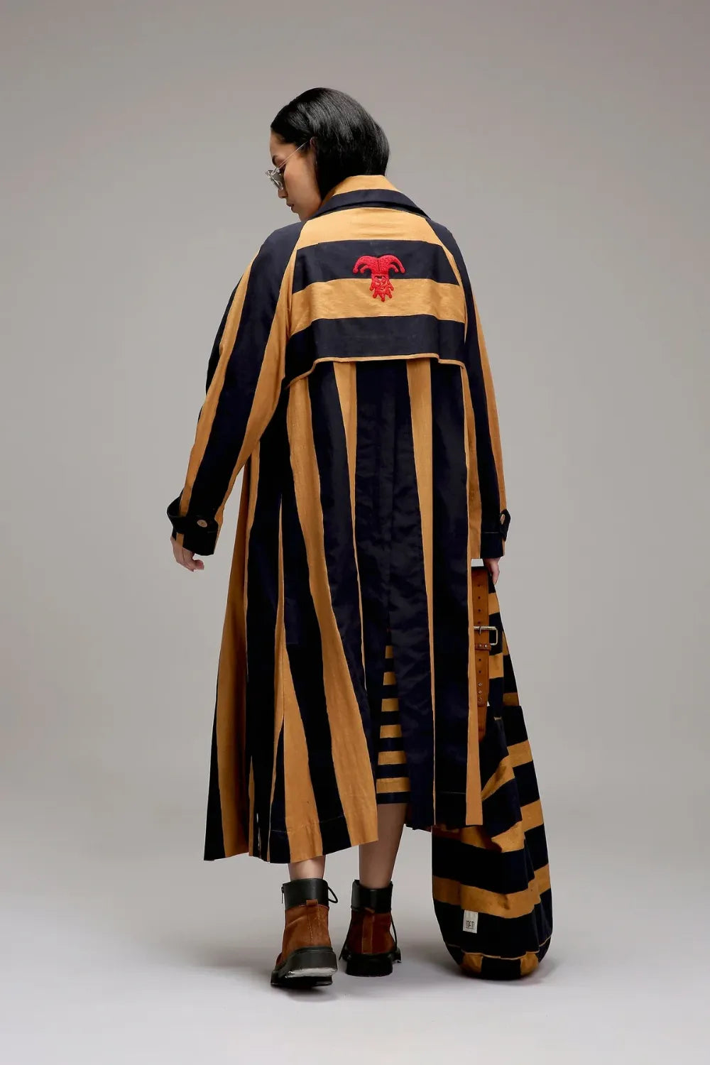 Crafted from handwoven cotton, this dress showcases beautifully hand block-printed stripes that lend a timeless, artisanal charm. Designed with both comfort and functionality in mind, it features two practical side pockets and a convenient back opening.The outfit comes with a big striped jacket, complete with two side pockets for added utility. A striking hand-embroidered joker at the back adds a playful, artistic accent to the overall look.