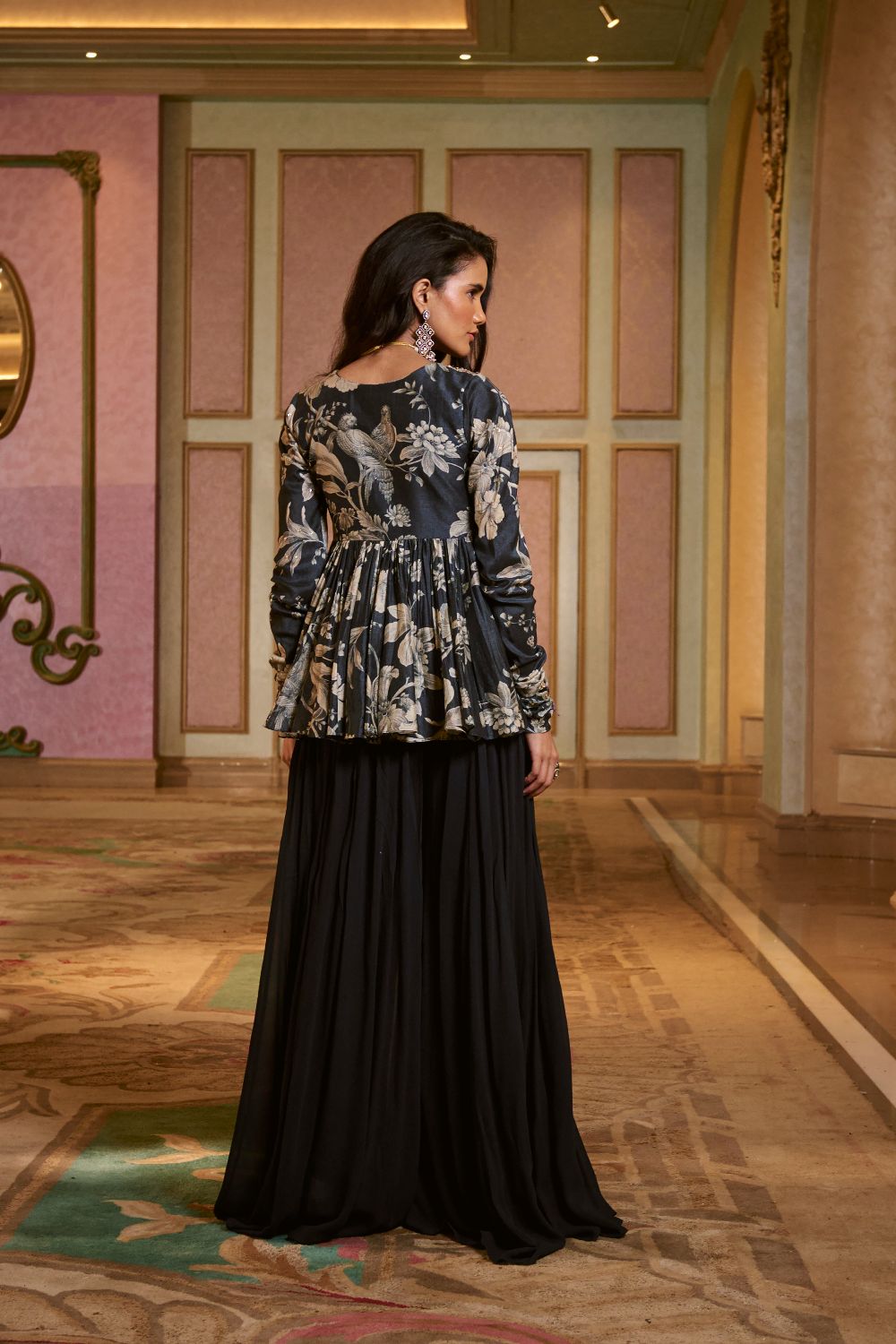 A navy blue floral-printed peplum set featuring a flattering V-neckline and a hand-embroidered yoke that lends artisanal charm. The churri sleeves are delicately embroidered, enhancing the silhouette with subtle depth and elegance. A drawstring waist with tassel detailing adds definition, while solid palazzos complete the look with a balance of ease and festive flair.