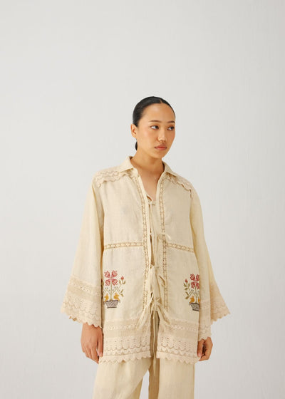 Tie up shirt-Ivory vase emb.