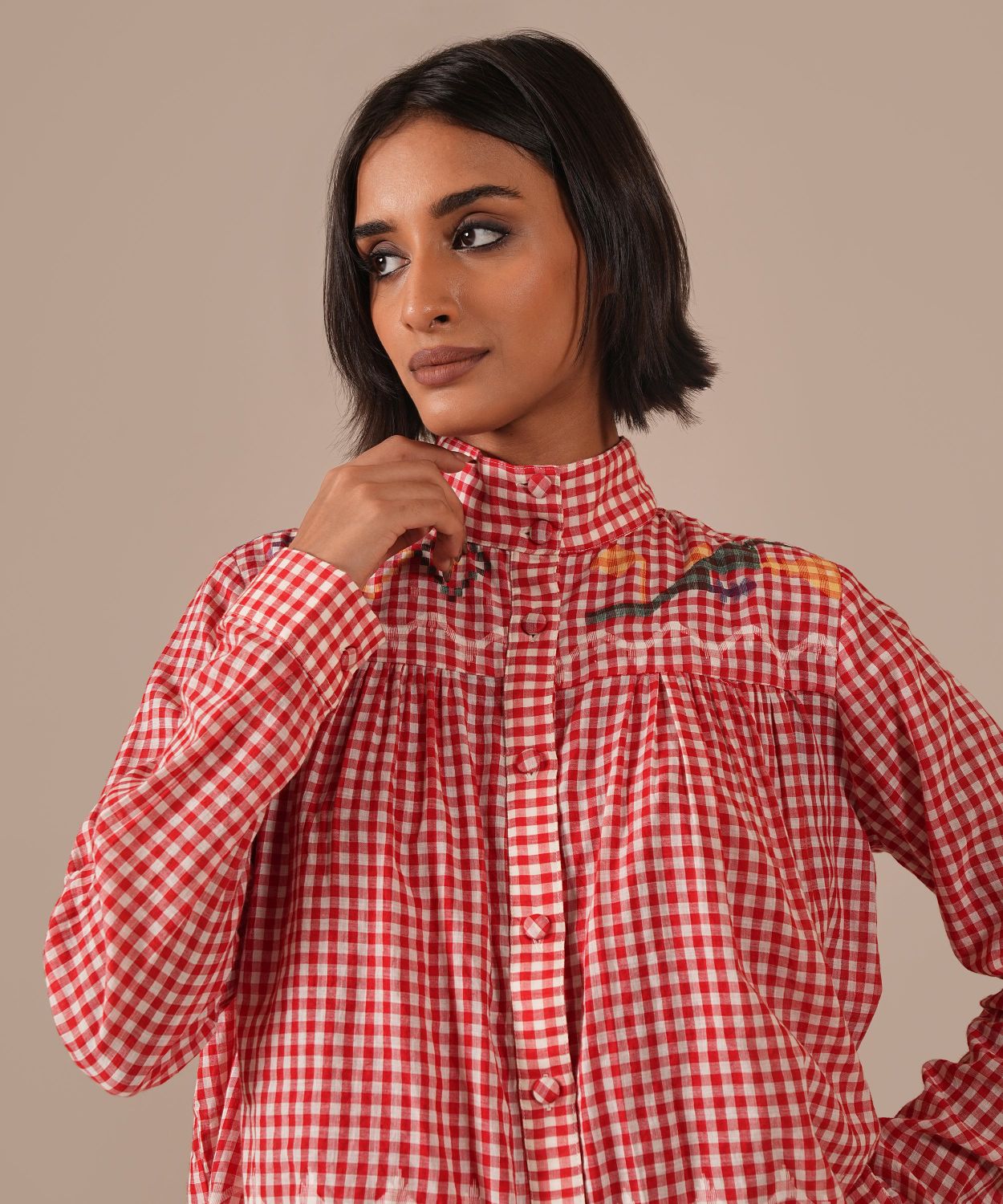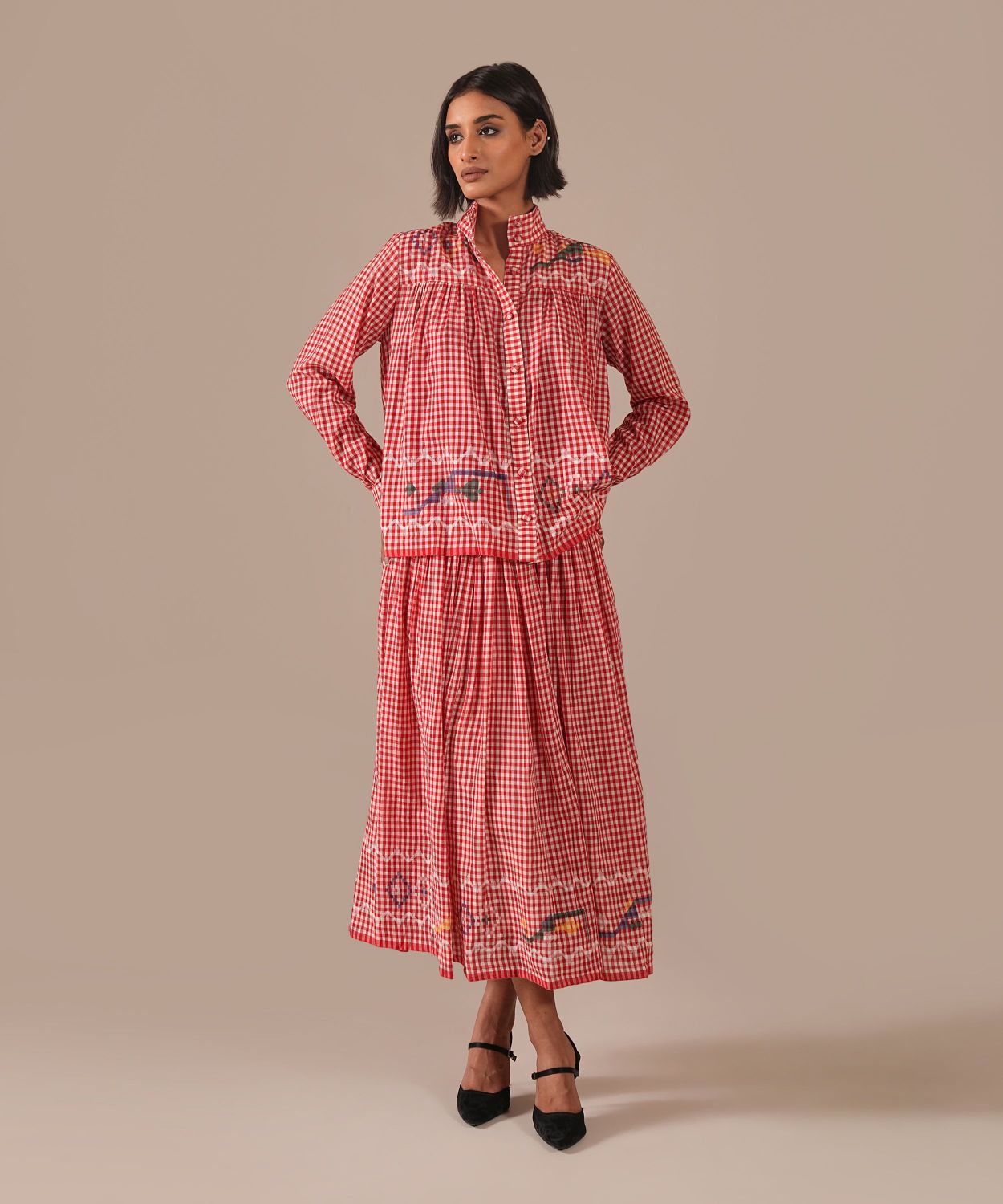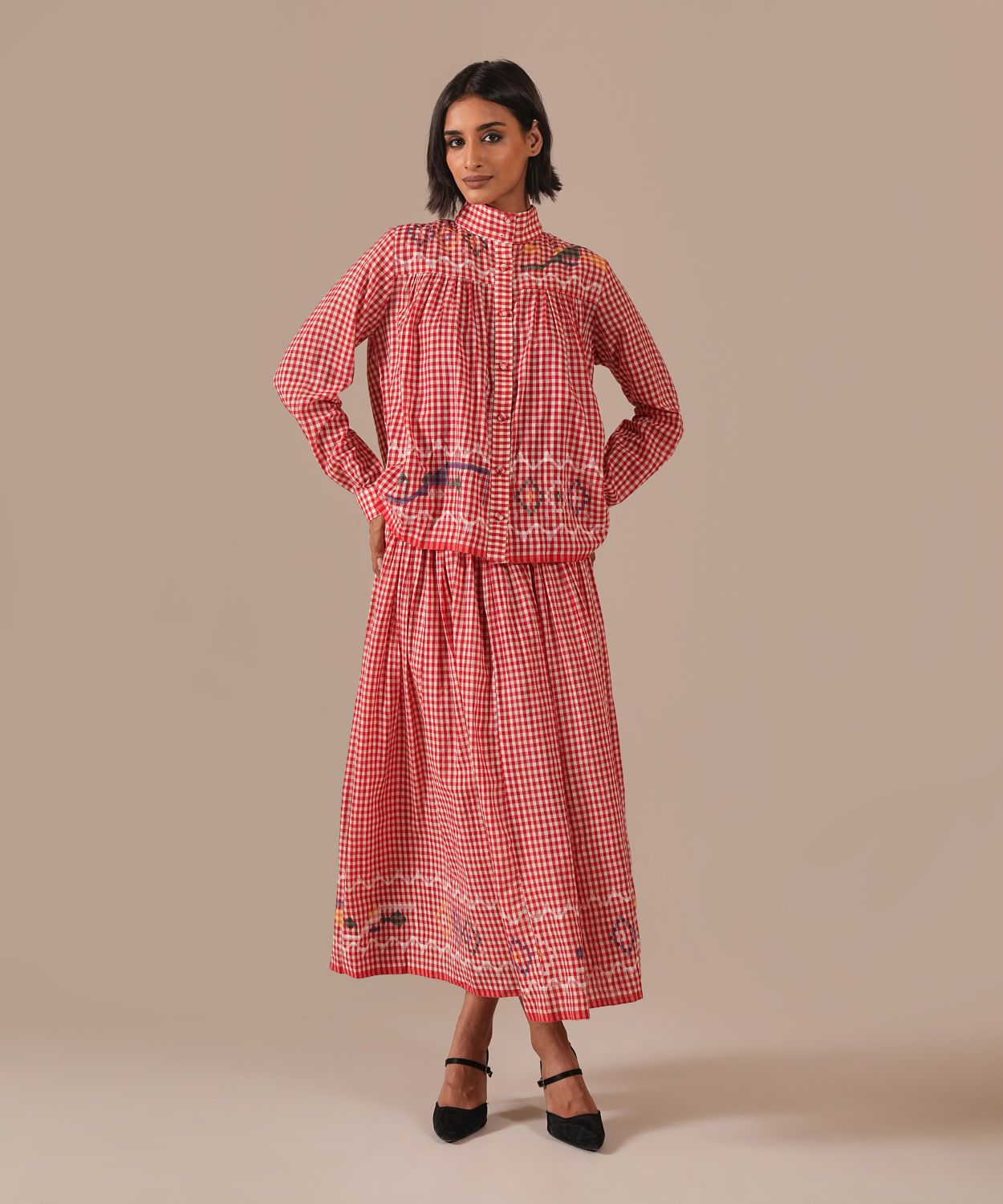 A handcrafted Jamdani ensemble with a gathered skirt, side zipper fastening, side pockets, and a co-ord high-collared shirt effortlessly refined and timeless.