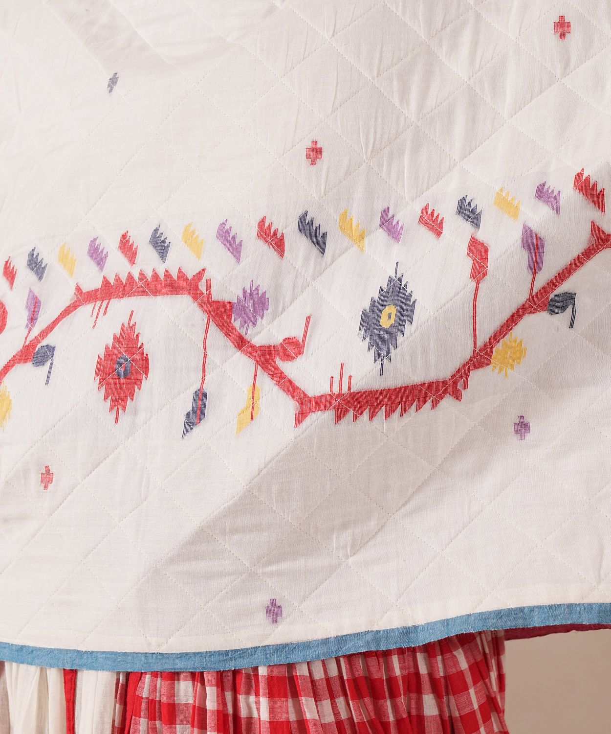 A classic Jamdani ensemble with a quilted boxy top and gathered skirt, enhanced by contrast panel detailing, an elasticated waist, and side pockets, a perfect harmony of artisanal craftsmanship and modern sophistication.