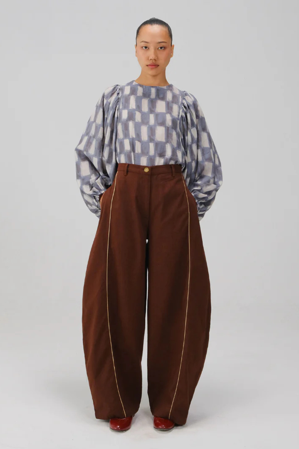 The Ana Set includes the Ana top and barrel-leg pants. The top features a round neck, gathered sleeves with bias-bound armholes, elasticated cuffs, and a back keyhole fastening. The barrel-leg pants have an exaggerated silhouette with piping, a band waist, and front button fastening.