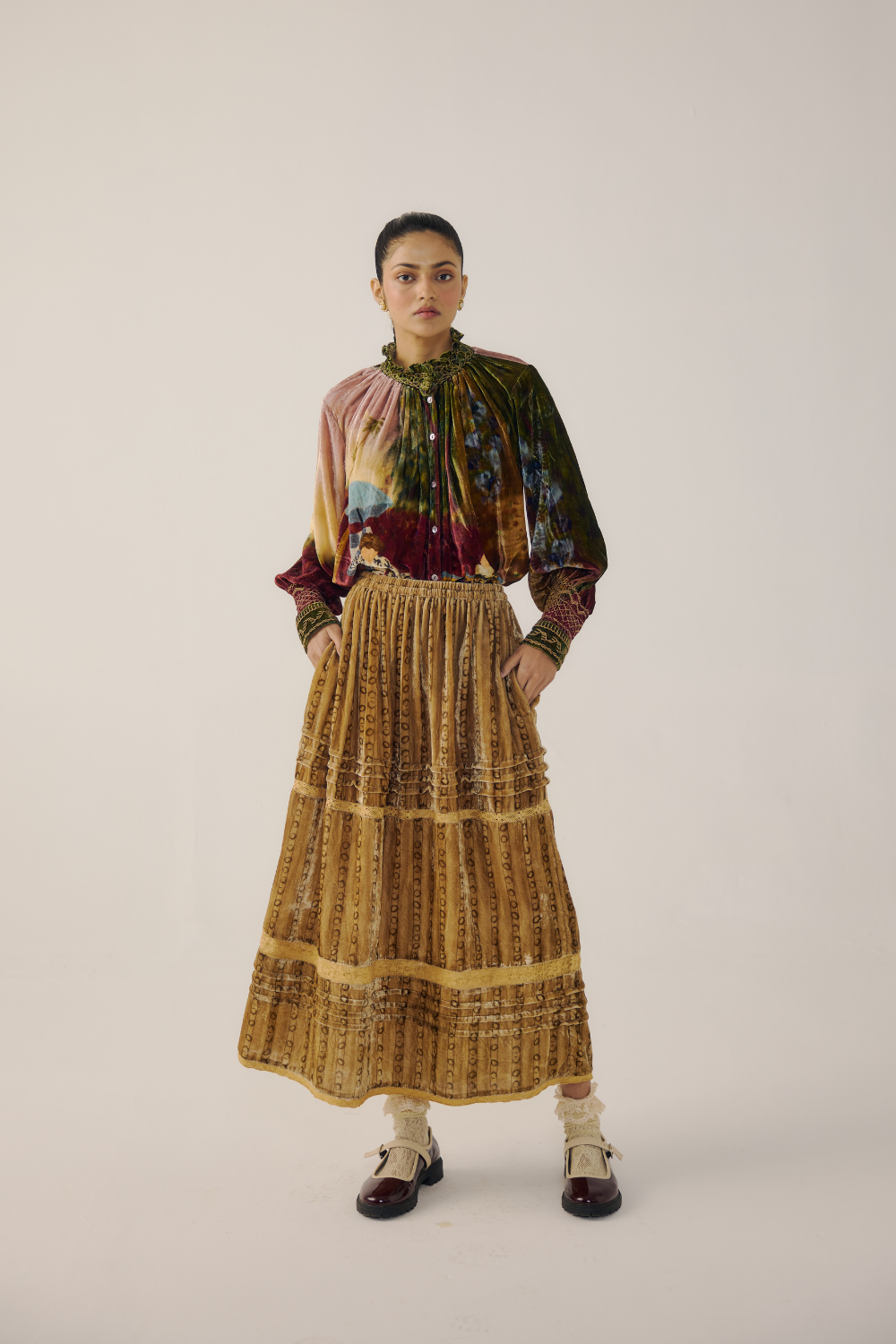 The Farmer Top is made from velvet fabric in Lakeside print. It features hand-smocking details on the neck and the bishop sleeves, along with front button details. Our classic Emily skirt, now crafted in velvet fabric adorned with a charming print for a cosy, stylish feel of comfort and elegance. Top