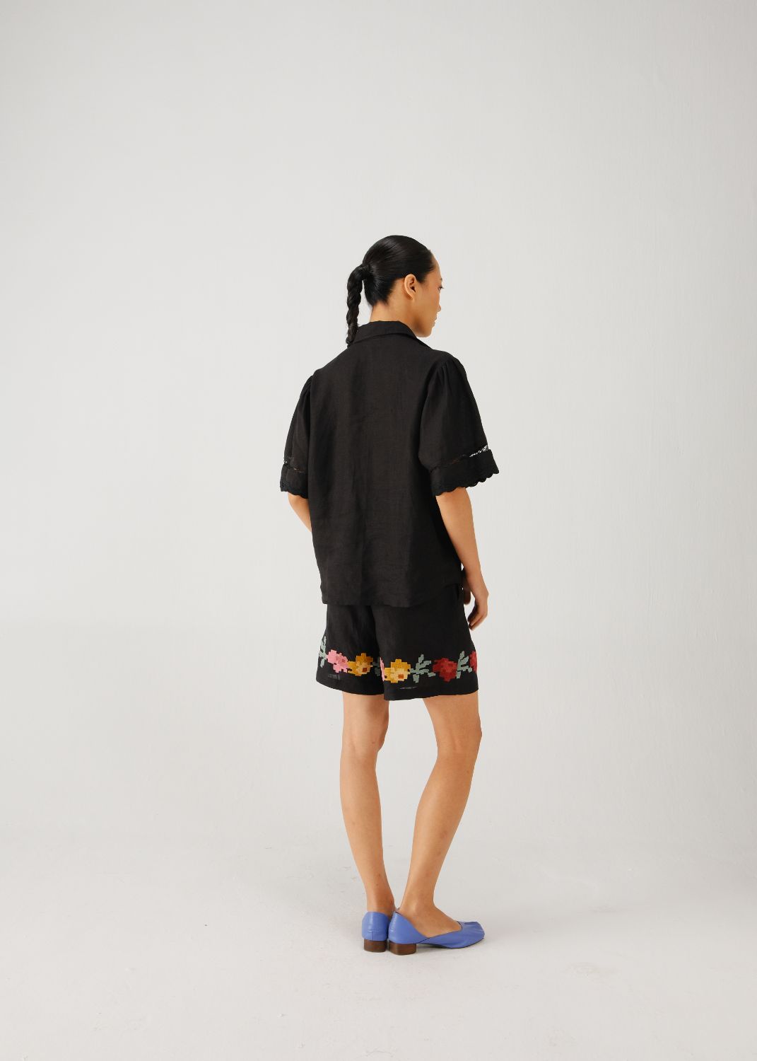 This shirt offers a blend of elegance and comfort. It has a button-up front and a boxy fit. The half-length puff sleeves are complemented by gathered shoulders. The shirt is detailed with intricate pixel embroidery on the front panel and a border along the hem, giving it a handcrafted feel. The set includes wide-leg shorts with pixel embroidery along the hem, which complements the detailing of the top. This coordinated outfit is a good choice for a comfortable look.