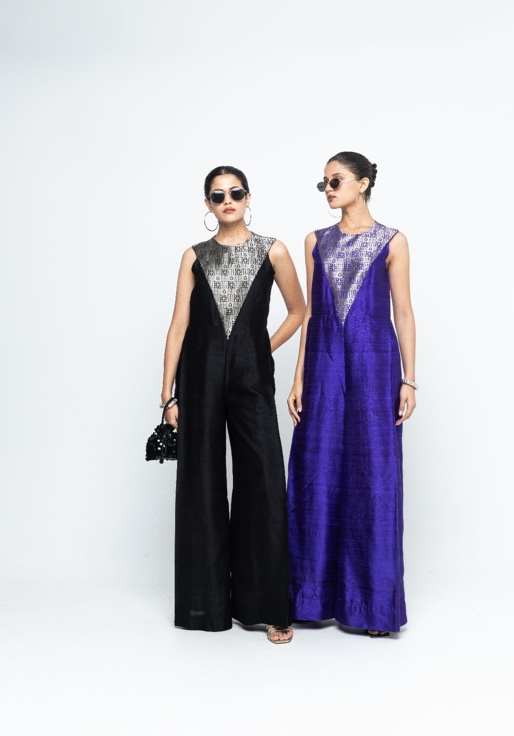 Black statement Raw Silkl Jumpsuit with Brocade detail at the neck and back.