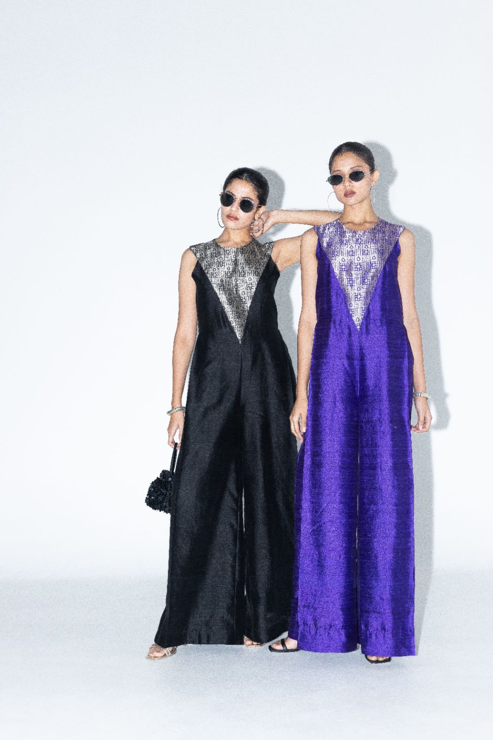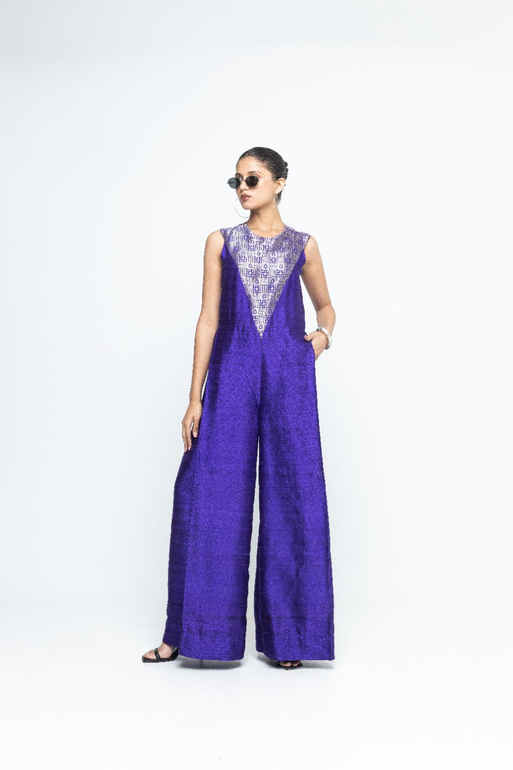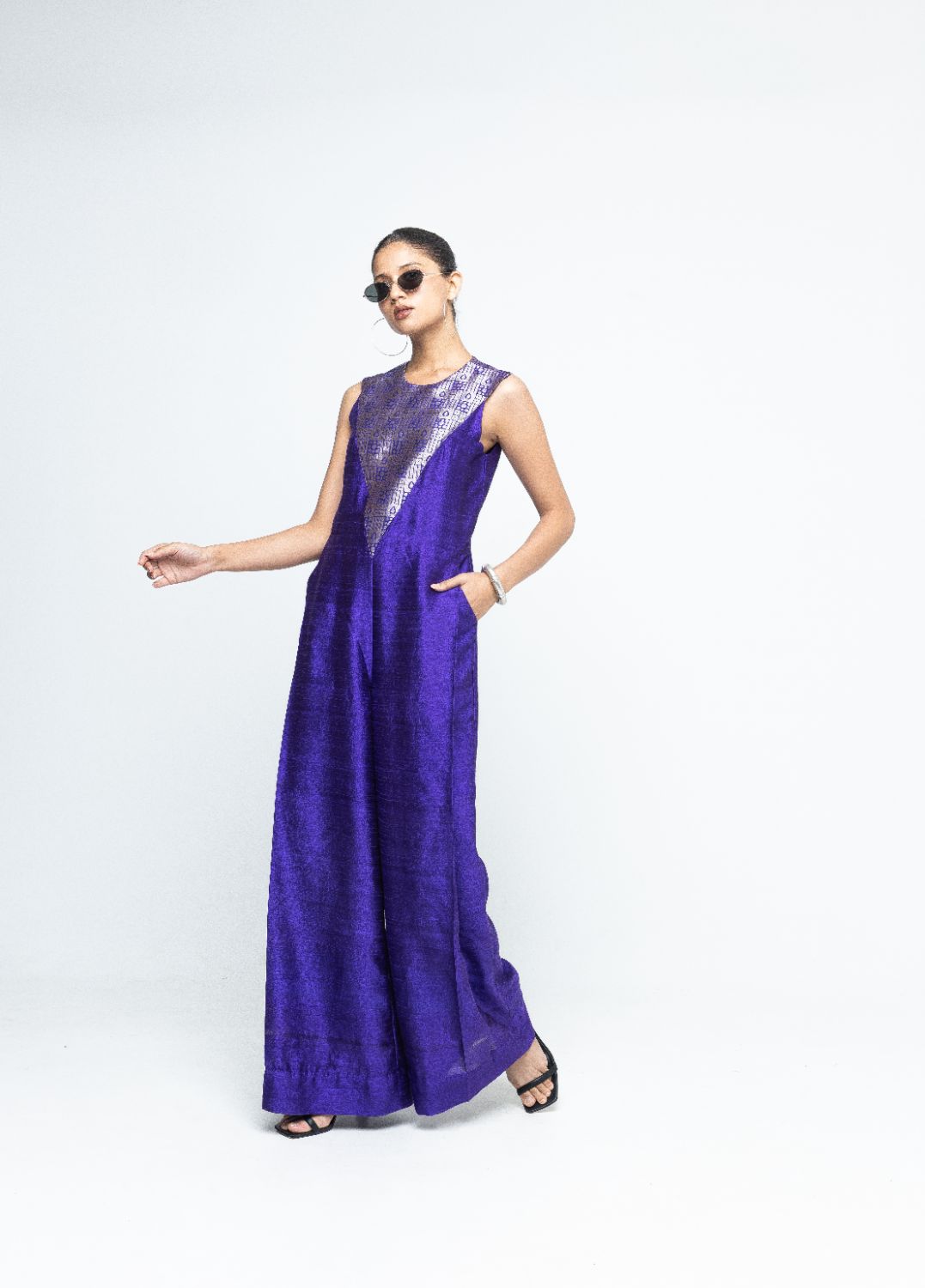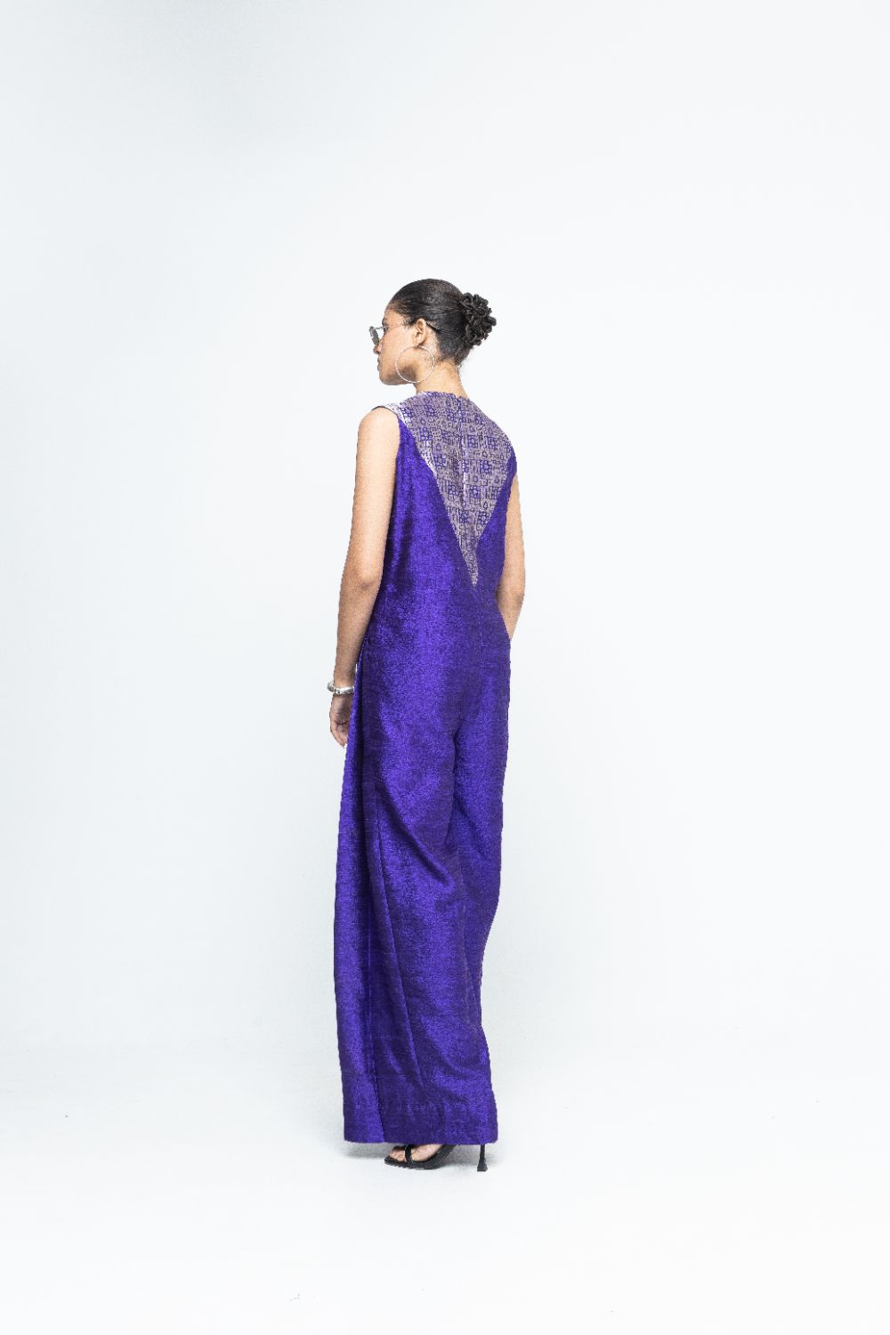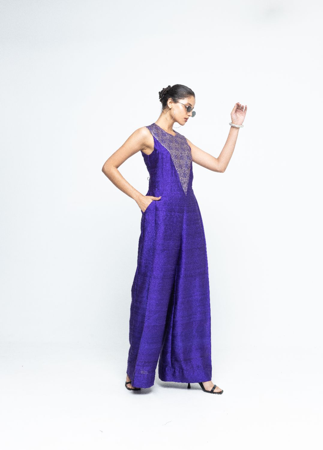 Purple statement Raw Silkl Jumpsuit with Brocade detail at the neck and back.