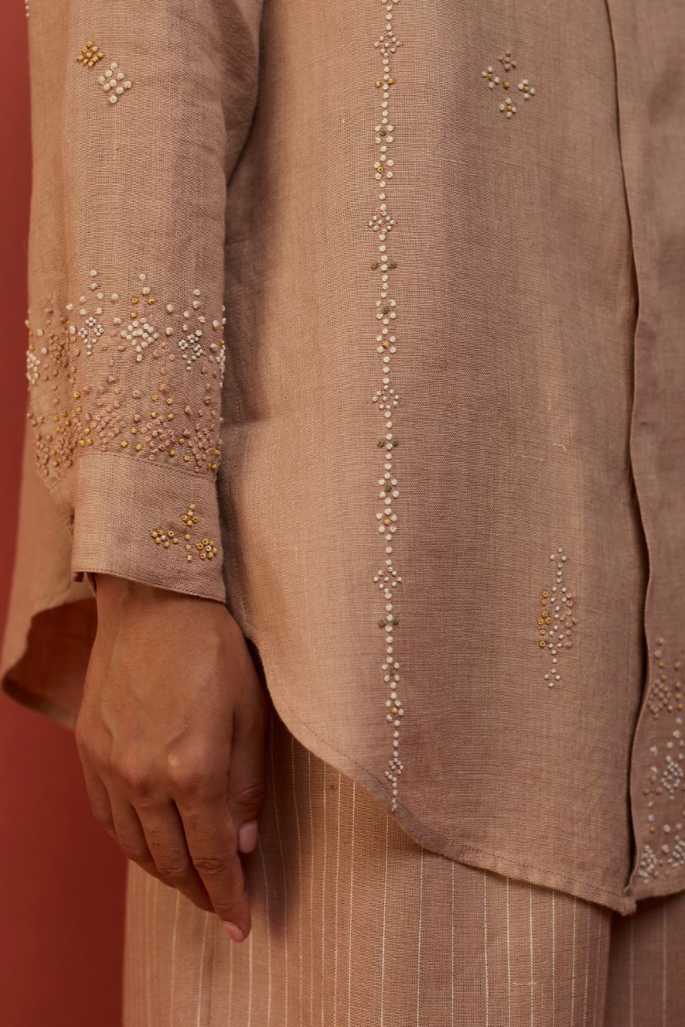 Shirt - A relaxed-fit button-down shirt in signature soft yarn-dyed linen, thoughtfully detailed with Tangalia weave inspired intricate french knot and multi-coloured bead hand-embroidery along the hem, cuff and bodice The shirt features a classic collar, curved hemline, and hidden placket for a clean finish—ideal for pairing with striped linen trousers or layering over summer dresses for an artfully crafted look.