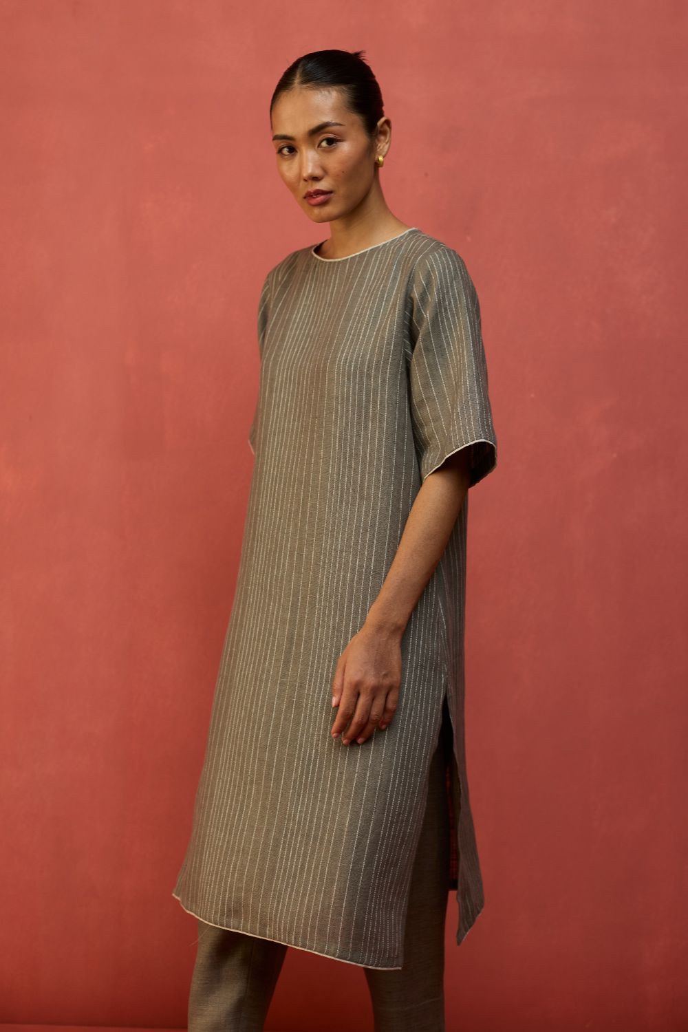 A classic boat-neck kurta crafted in breathable yarn-dyed stripe linen with intricate woven constrast selvedge piping along the neckline, sleeves and bodice hemline. The kurta is designed with elbow-length sleeves and lengthened side slits making it ideal for all-day comfort. The Semma pairs beautifully with matching solid linen trousers for a versatile, elegant look.
