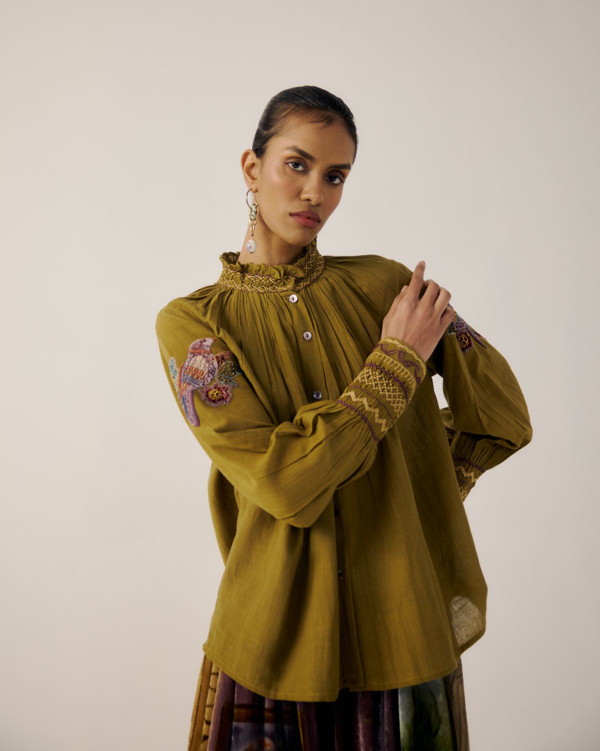 The Farmer Top is made from Cotton in our Parrot emb.. It features hand-smocking details on the neck and the bishop sleeves along with front button details