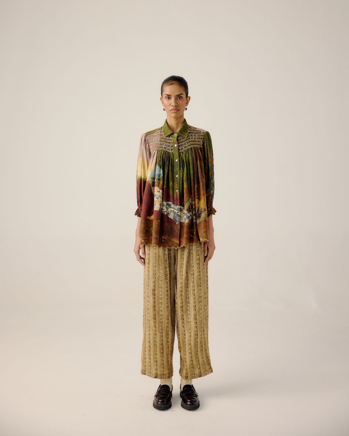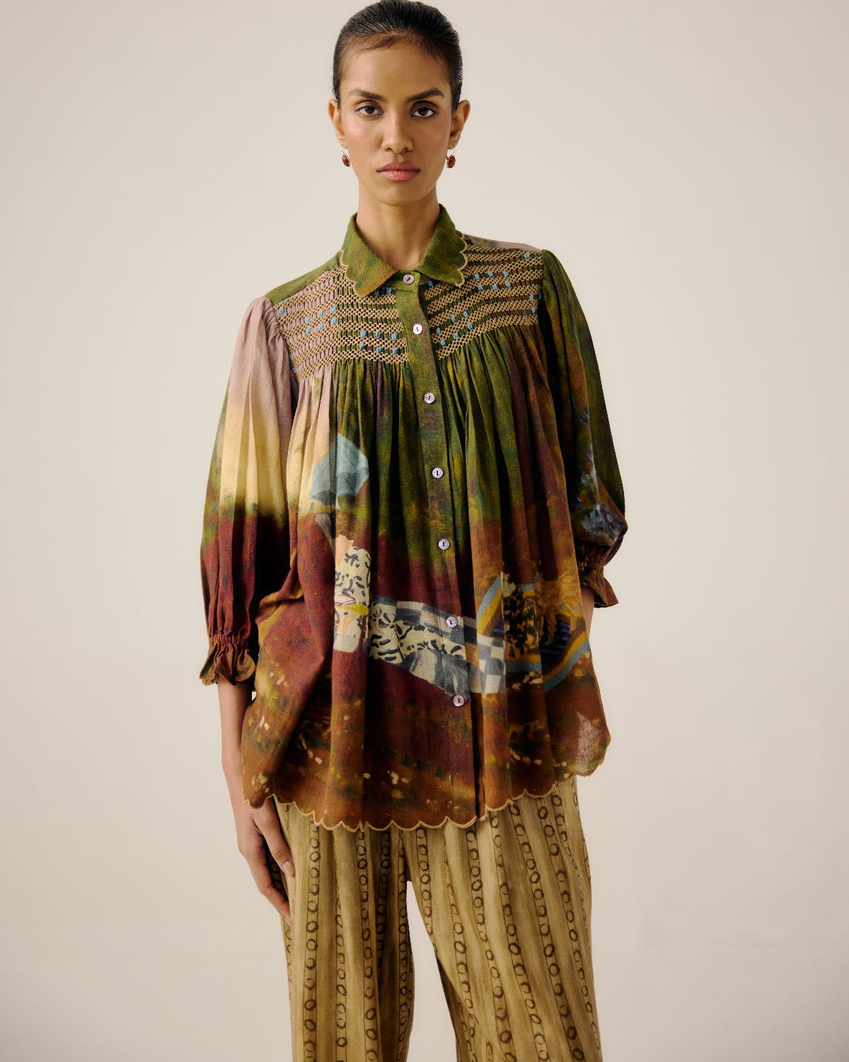 Made in pure cotton, the Judy Top is relaxed buttondown , A line silhouette featuring elegant smocking on the shoulders and scalloped edging collar and hem. The top has 3/4-length sleeves finished with elasticated cuffs for ease. Silhouette: Button-down shirt Yoke: Hand-smocked detailing for added texture
