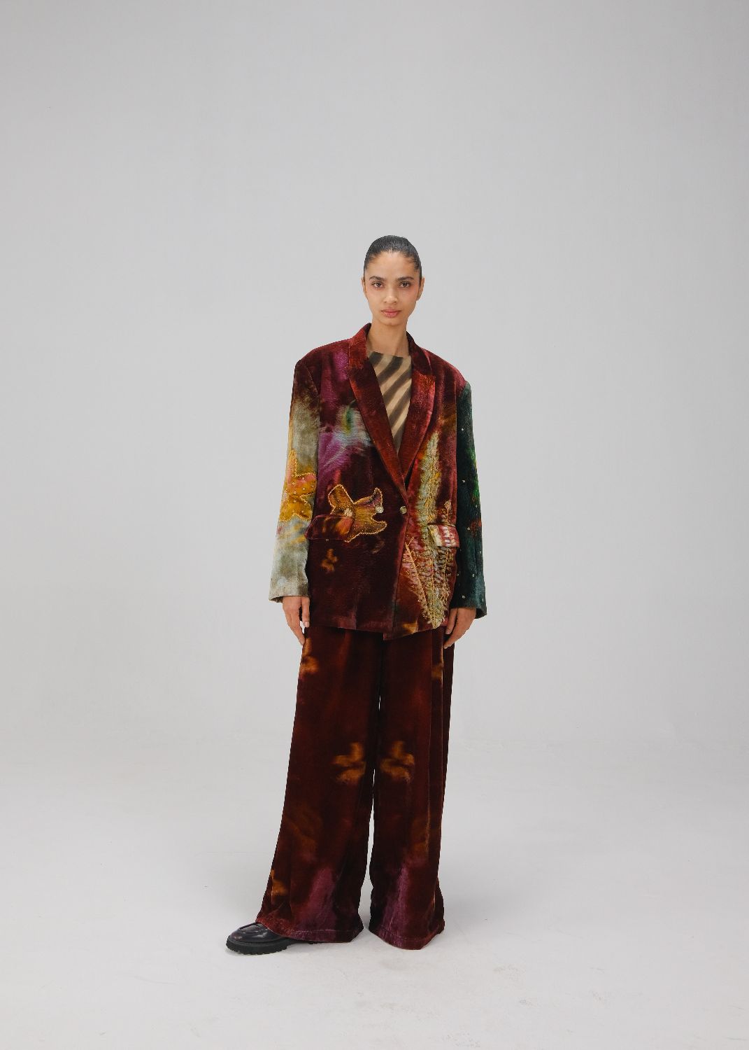 The Oversized set consists of an oversized blazer and lounge pants. The blazer features notched lapel collars and offers a perfect blend of comfort and style. The lounge pants are long and flared with a front pleat and an elasticated back.