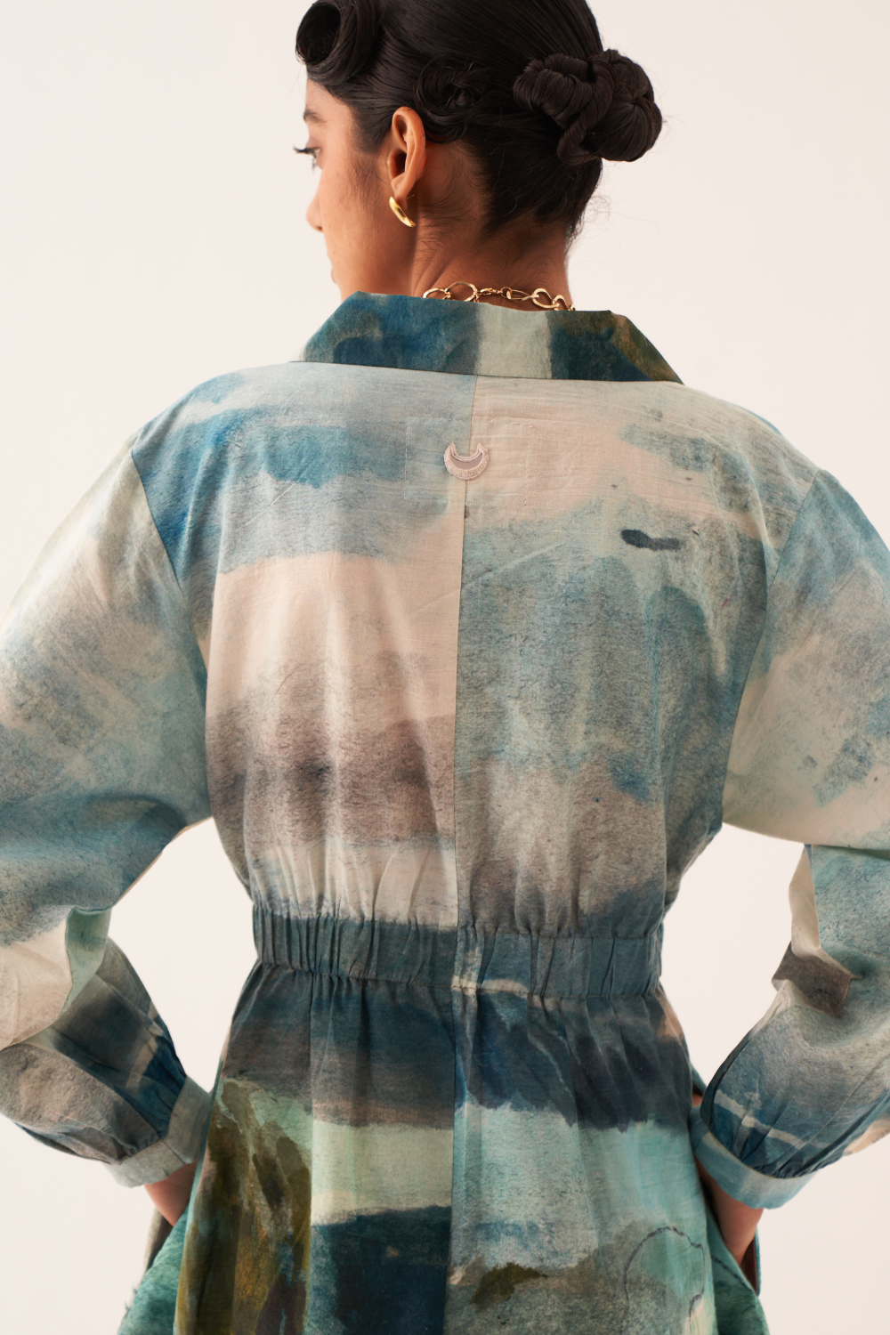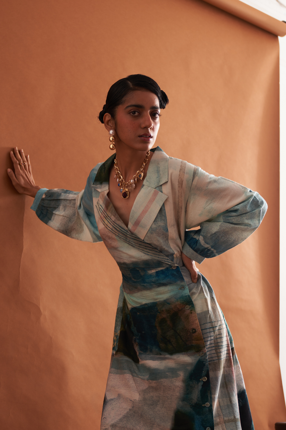 Double breasted A-Line Dress, features lapel collar and elasticed wiast for a structured fit. It has a gathered sleeveswith cuffs, and checks detailing. Functional side pockets, and OFR’s signature lune embroidery on the back. Print placements will vary—single piece. Model is wearing size XS/S. Garment Length 49"