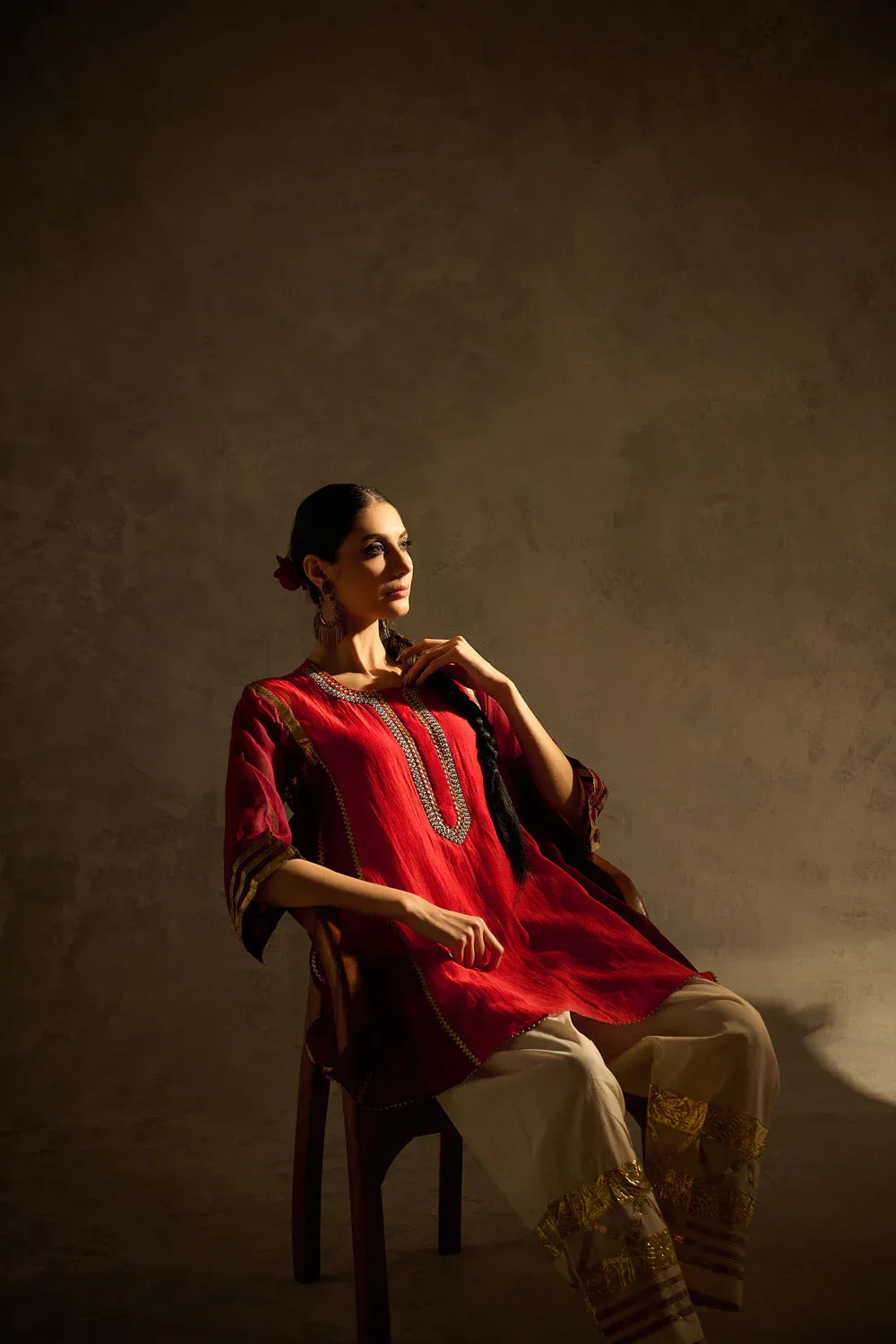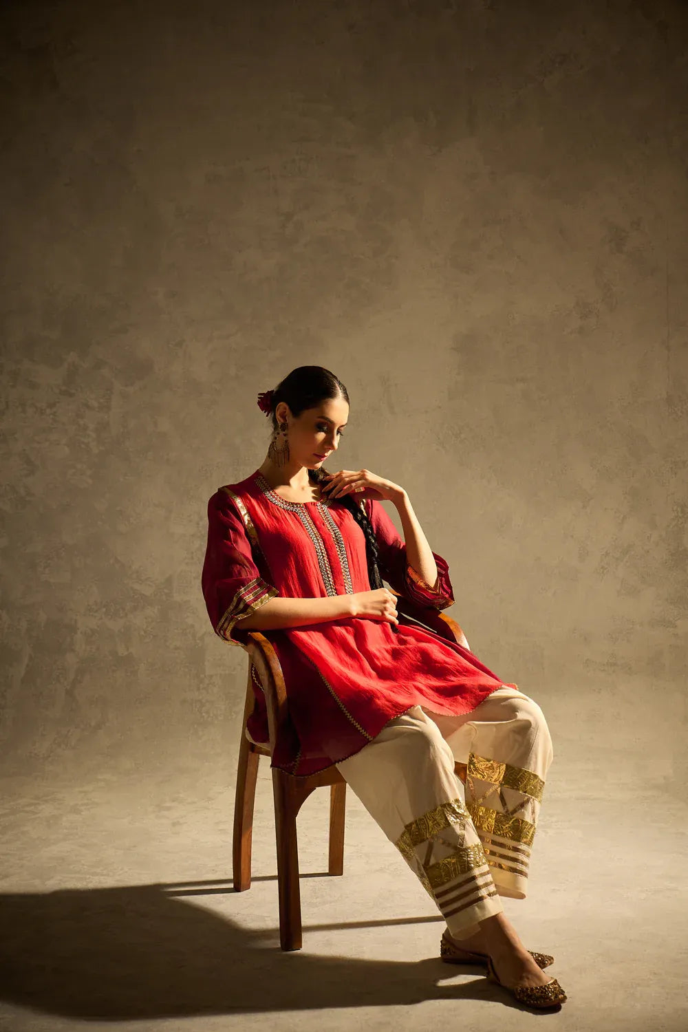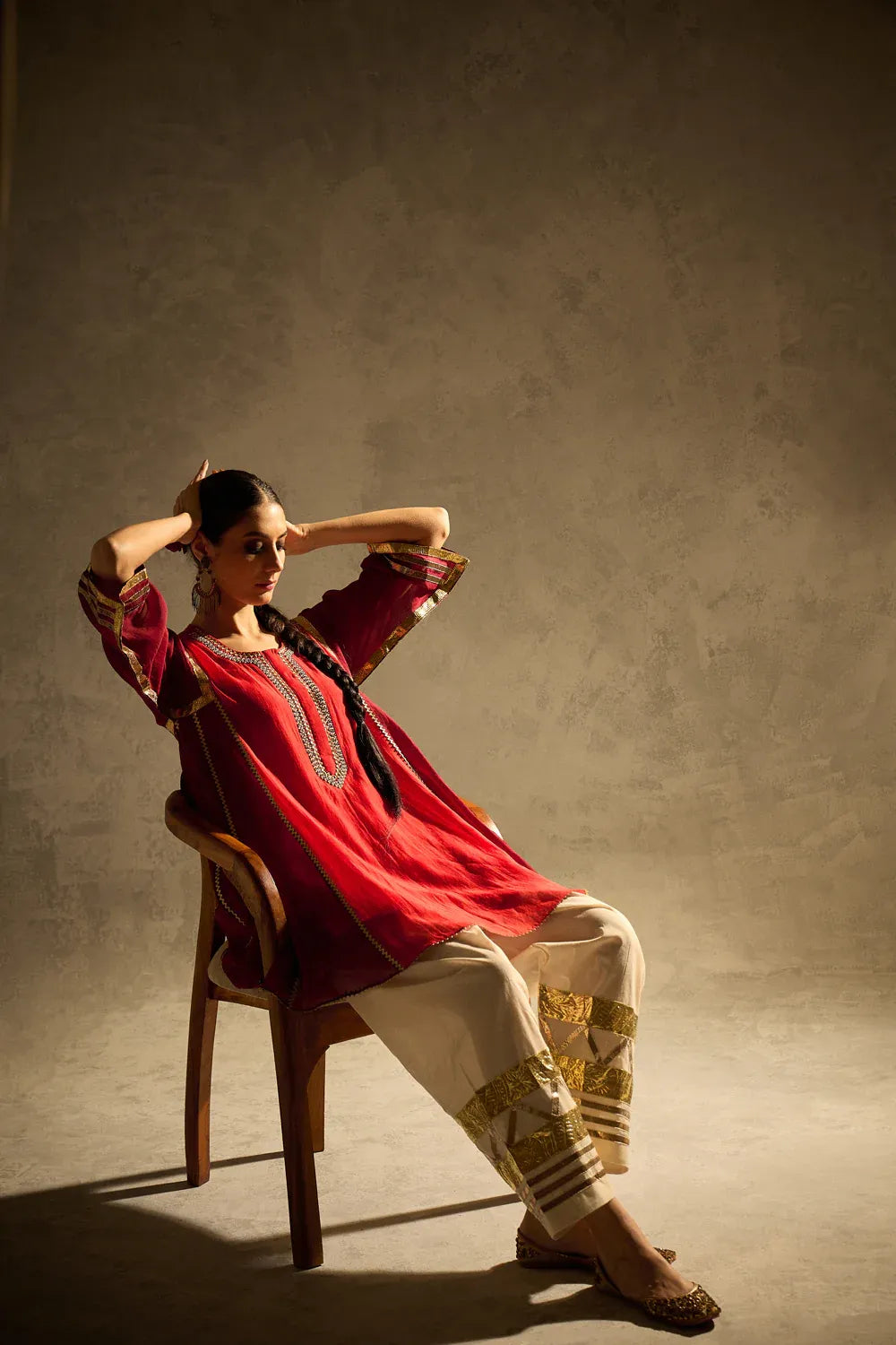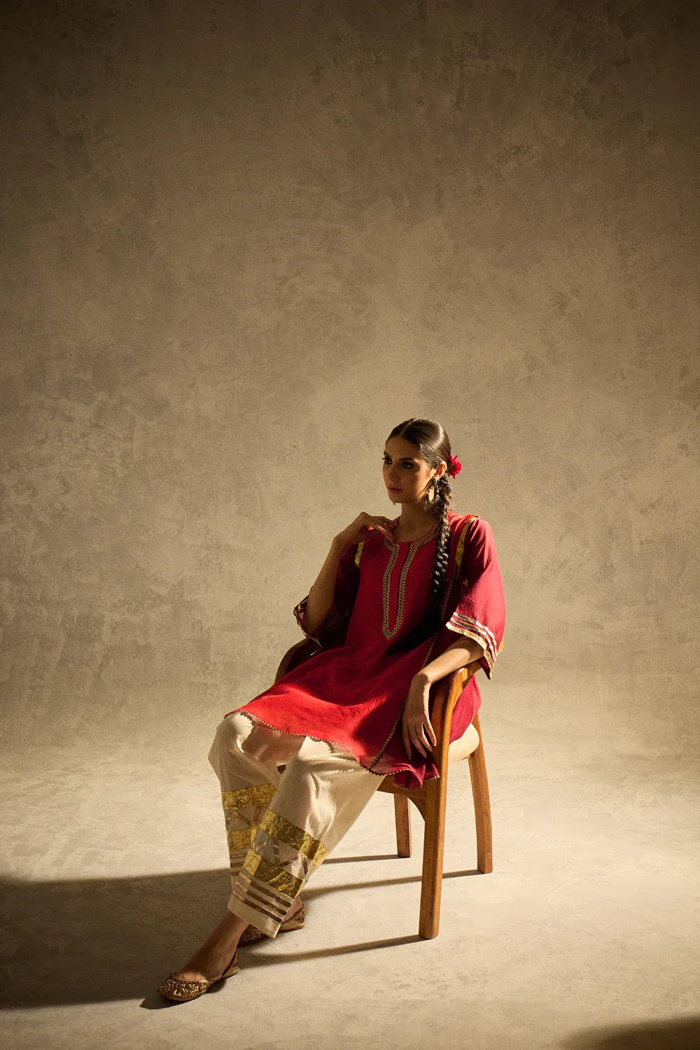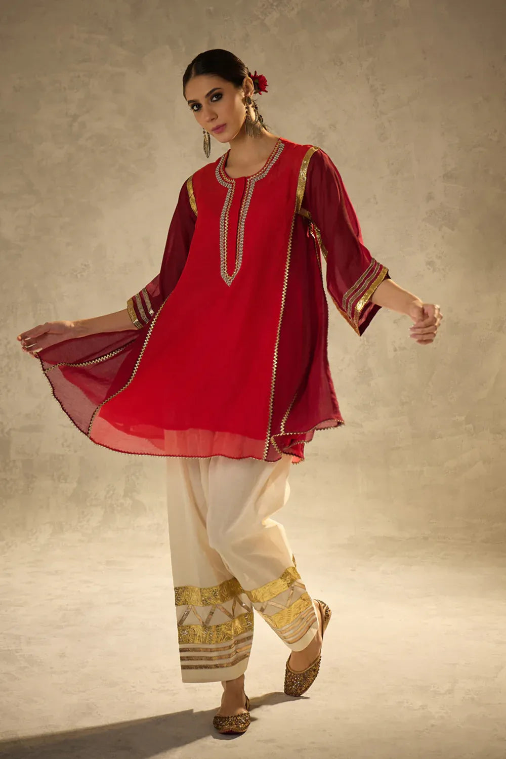 A vibrant red kalidaar kurta crafted with delicate sucha gota work, blending classic cuts with modern refinement. The kurta features clean lines and thoughtful detailing, paired with our timeless gota salwar highlighted with artistic gota patterns.