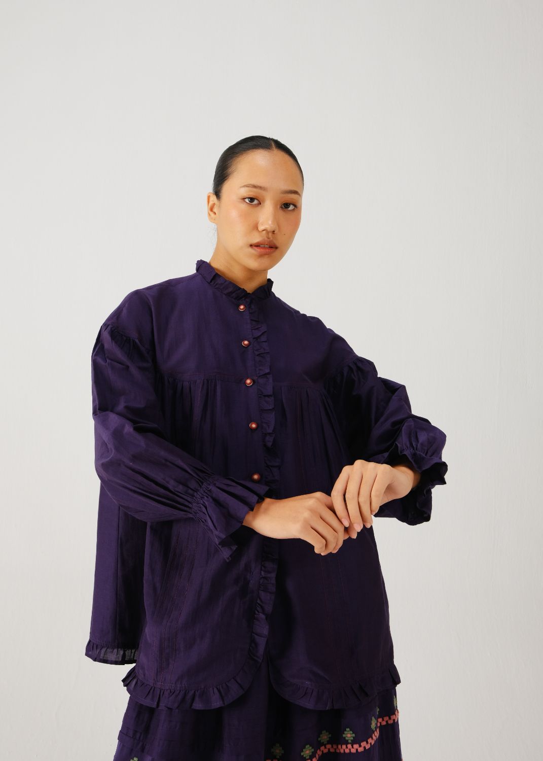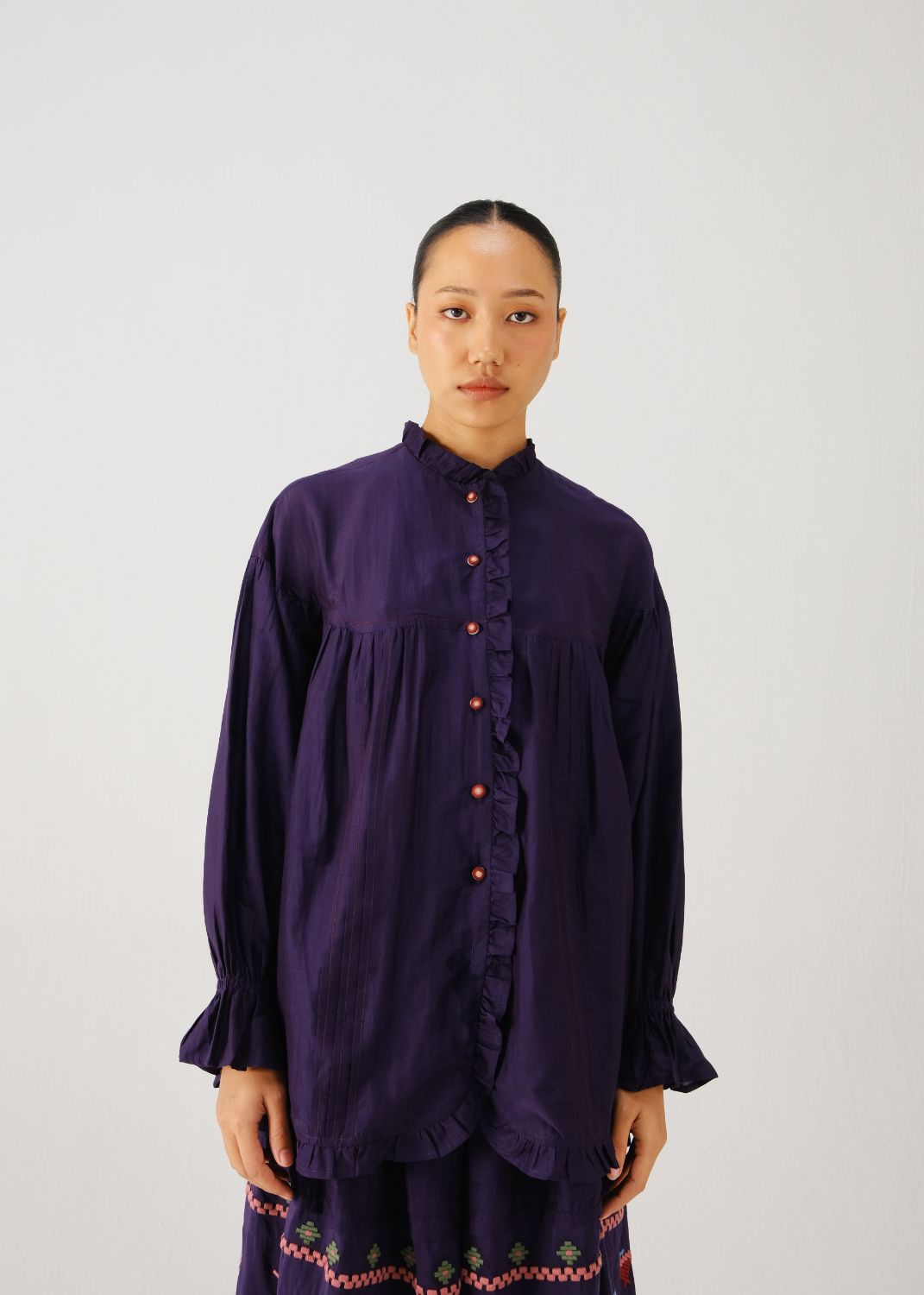 The Fiji Top is crafted in cotton-silk featuring contrast stitching, pintuck detailing, and elasticated cuffs. A frill collar runs along the placket cuff and hem finished with embroidered button details at the front opening.