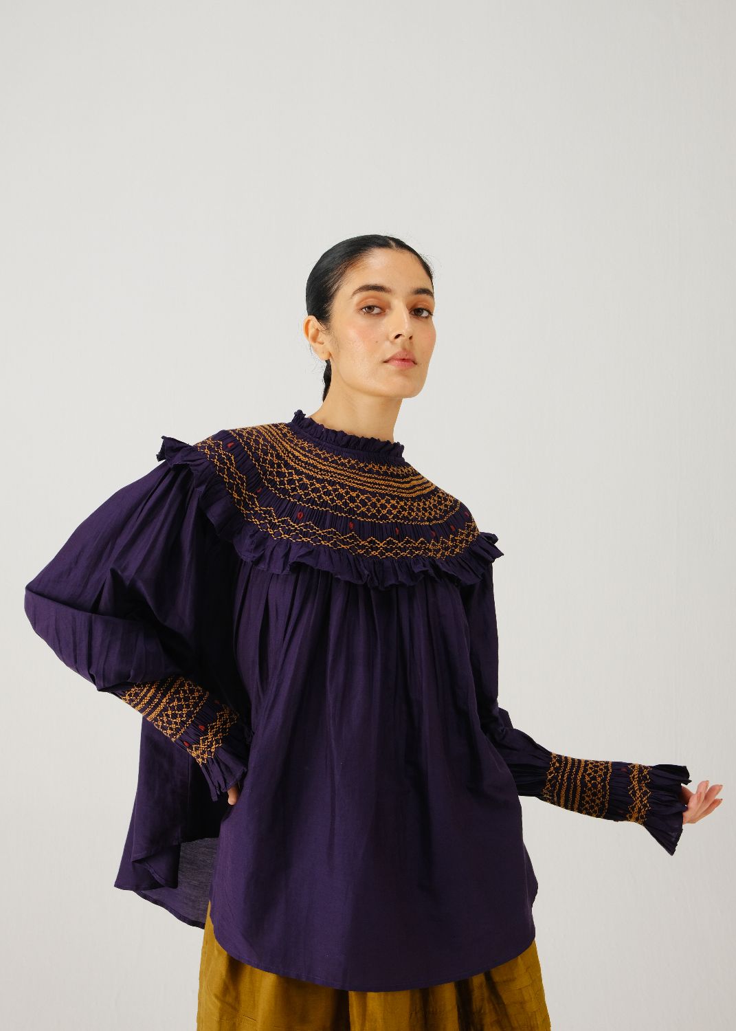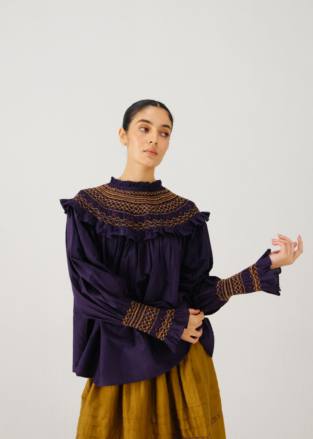 Theo Top is crafted in cotton-silk in our signature X-ray print, featuring a exaggerated smocked shoulder yoke and bishop sleeves with smocked cuff detailing.