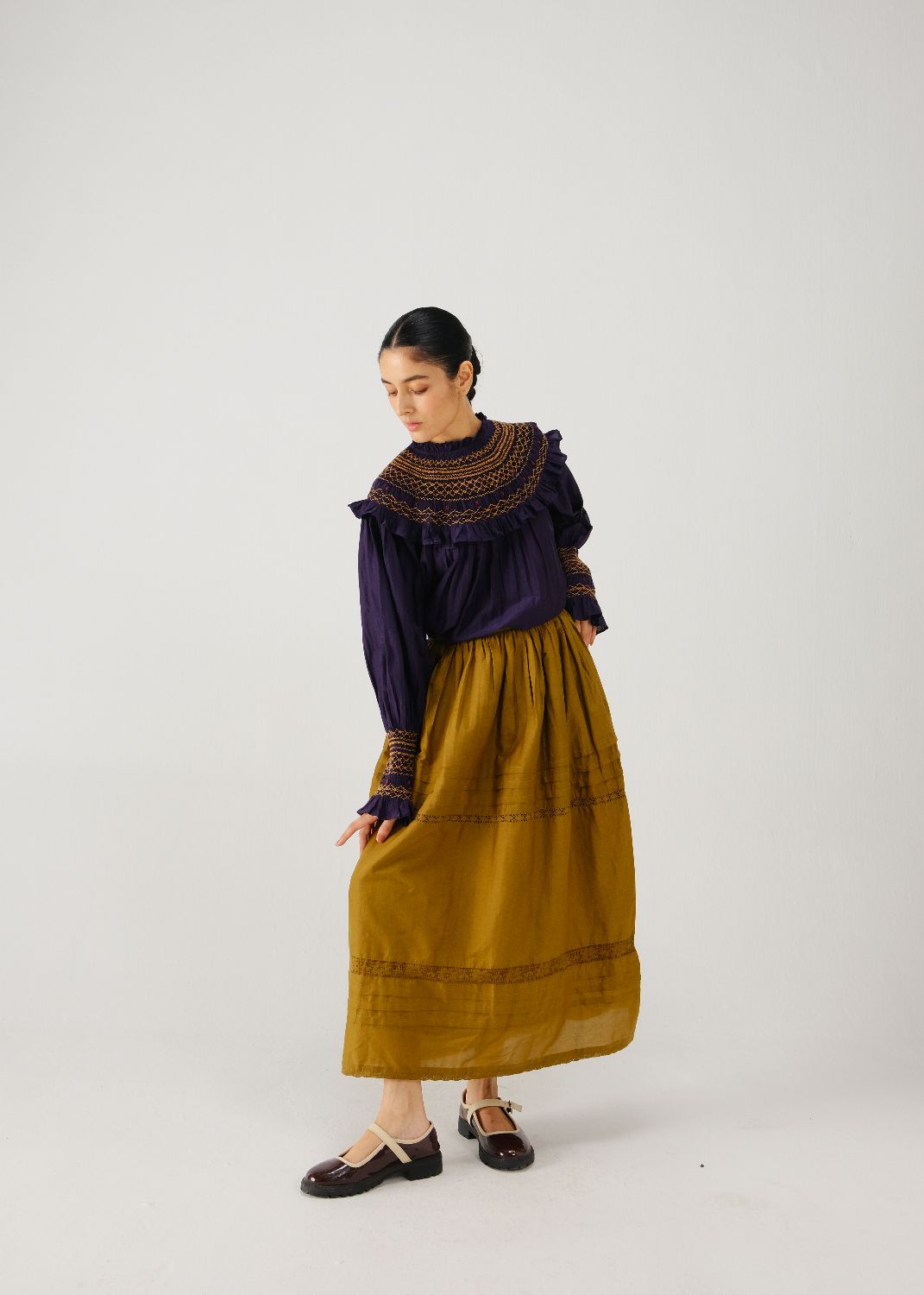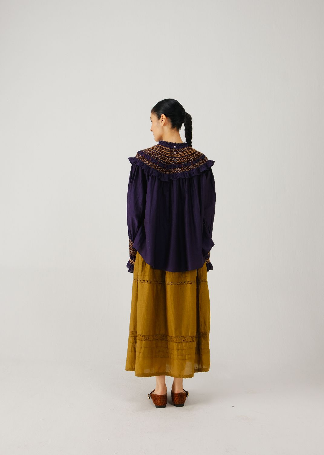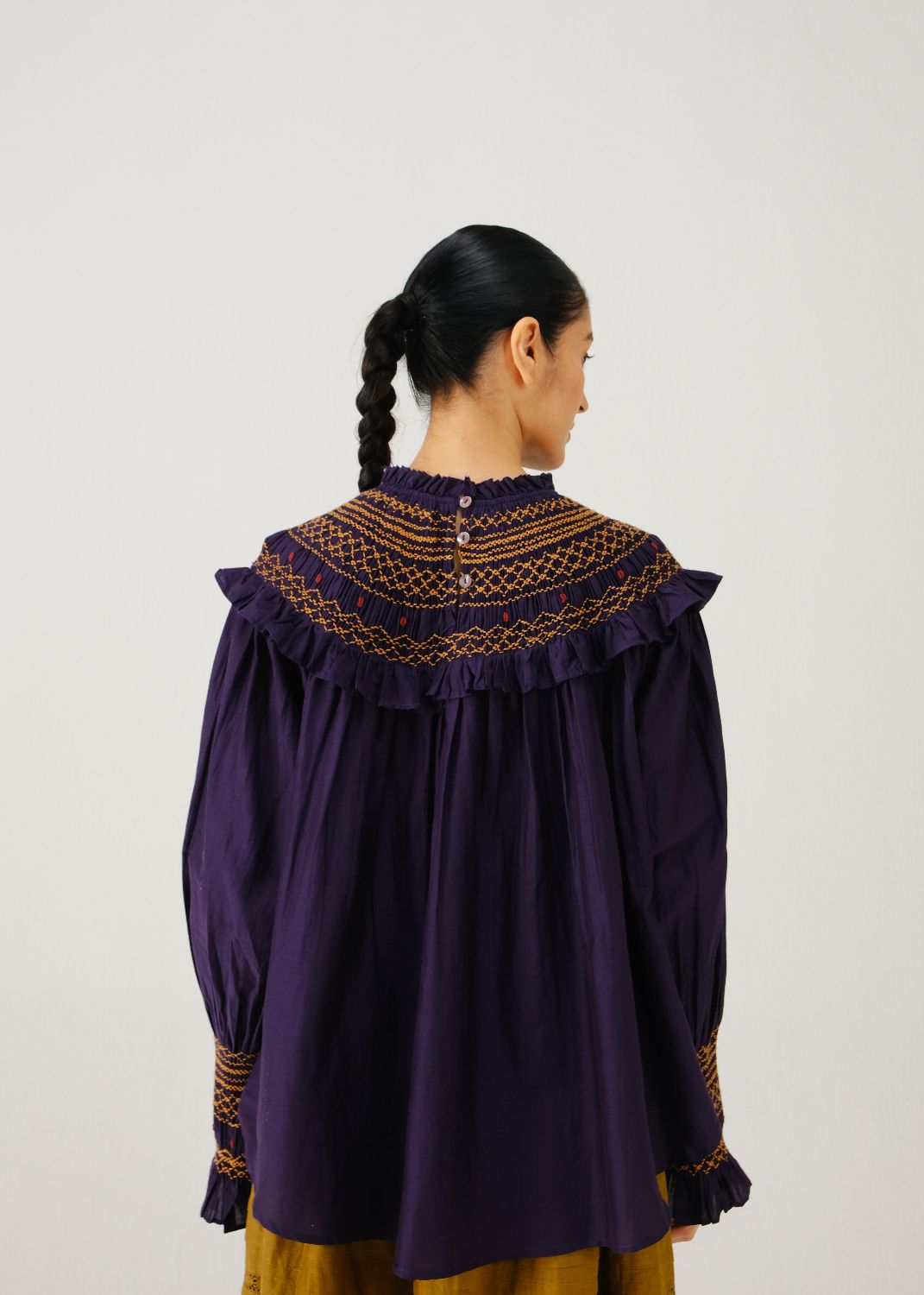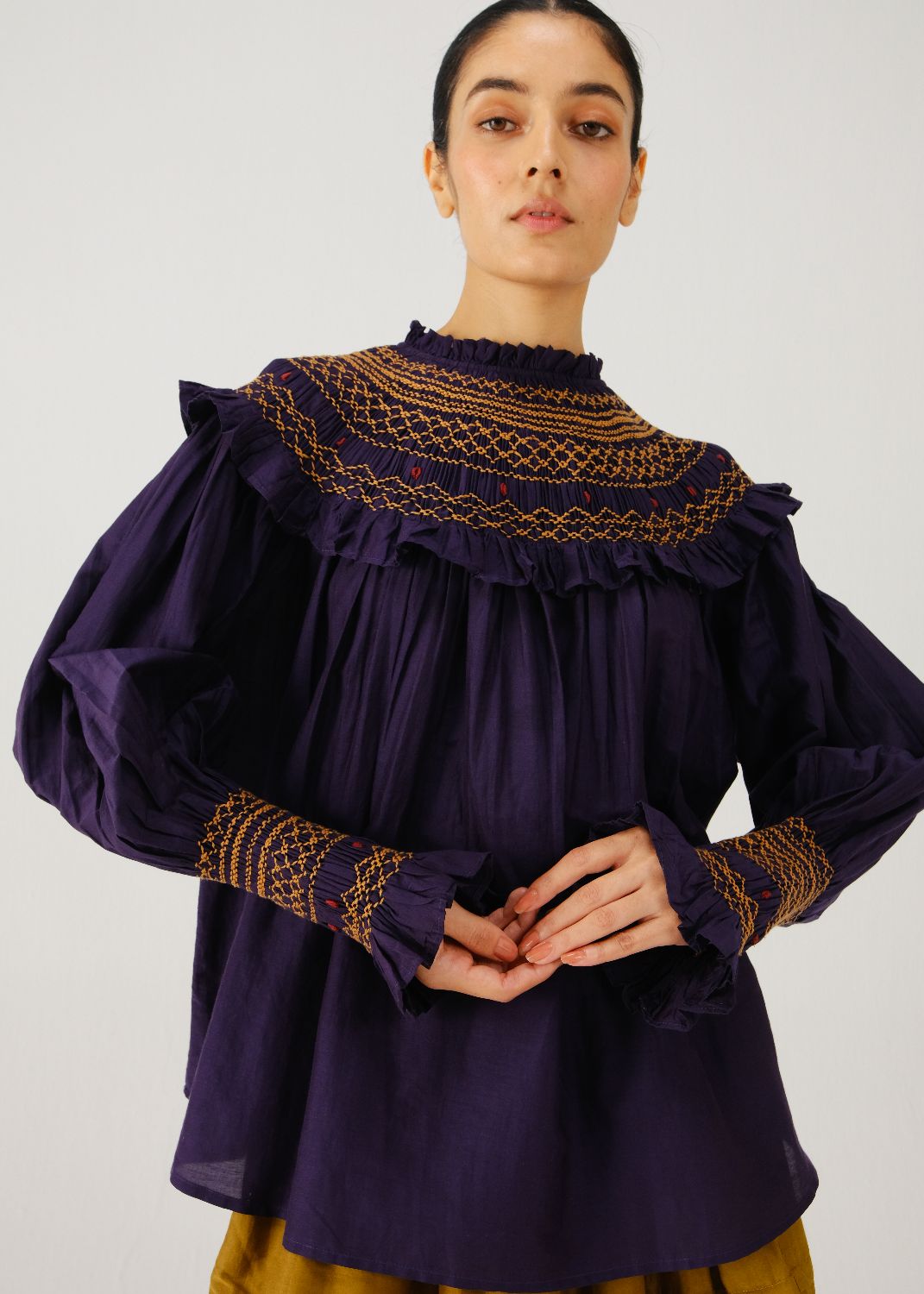 Details: smocked shoulder yoke and bishop sleeves with smocked cuff detailing