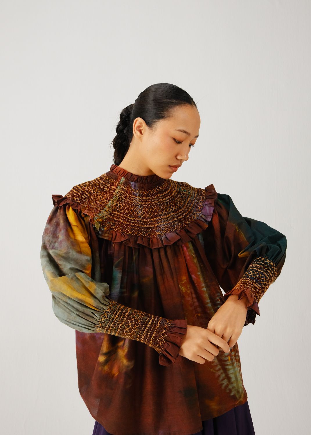 Theo Top is crafted in cotton-silk in our signature X-ray print, featuring a exaggerated smocked shoulder yoke and bishop sleeves with smocked cuff detailing.