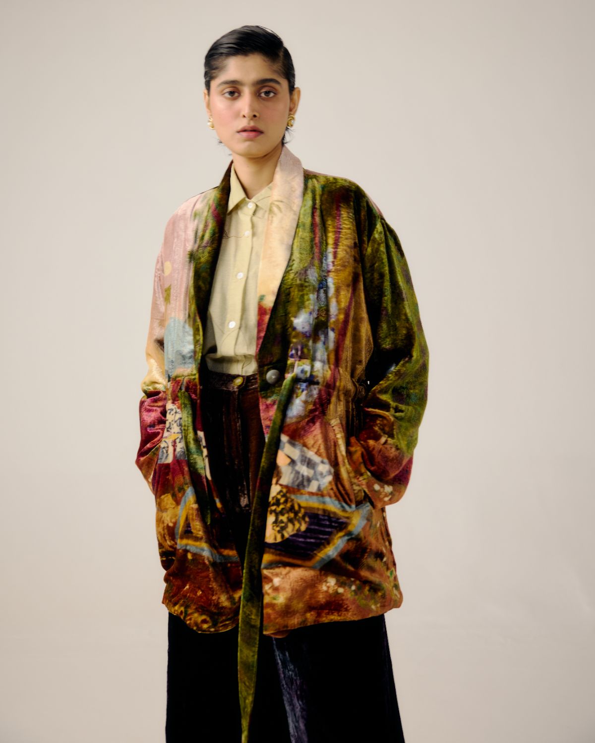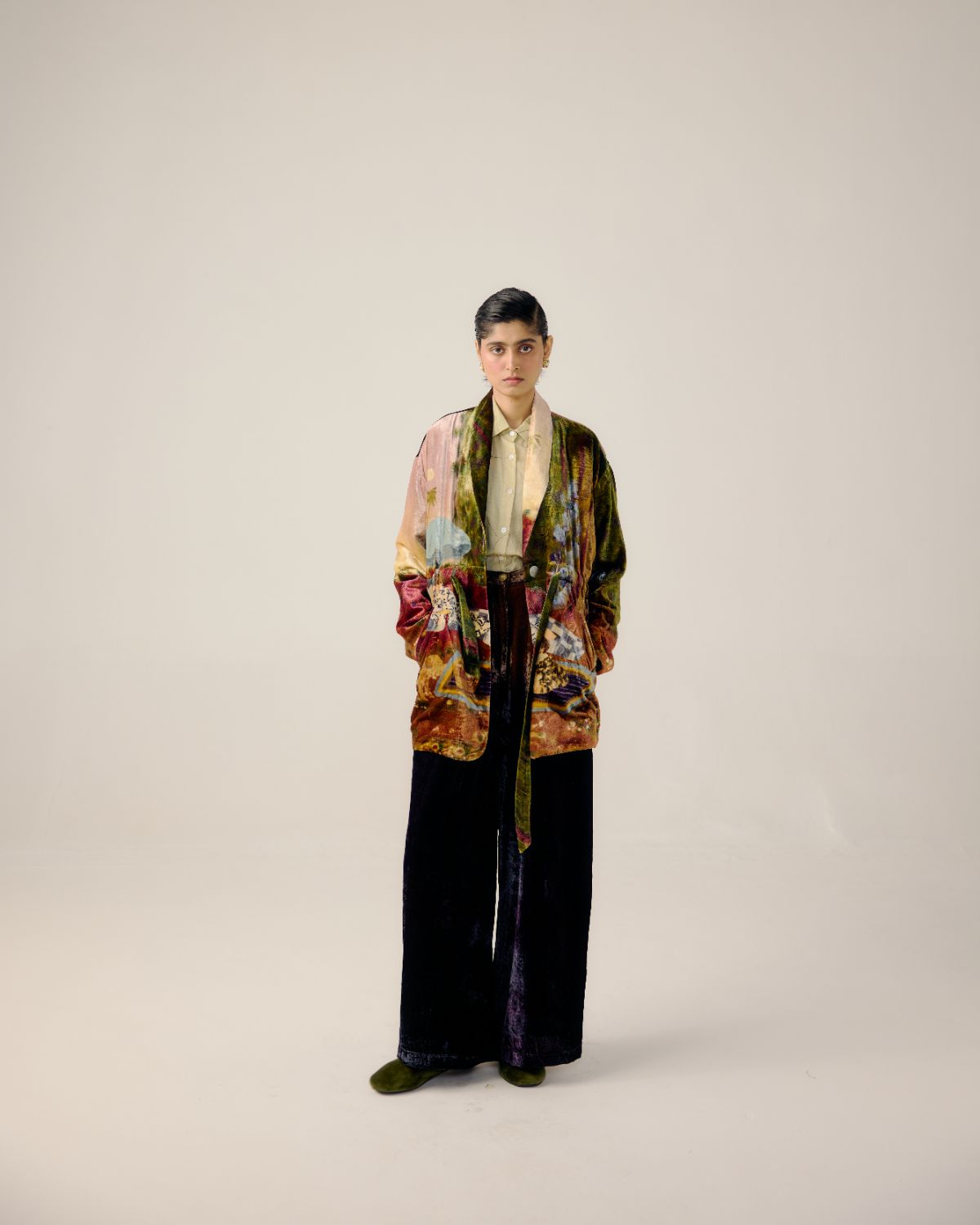 The Artist Set pairs the contemporary Artist Blazer with the elegant Emily Skirt. The blazer features a shawl collar and a front adjustable contrasting belt for a personalized fit and modern edge, while the skirt complements it with a refined silhouette—creating a polished, artistic ensemble.