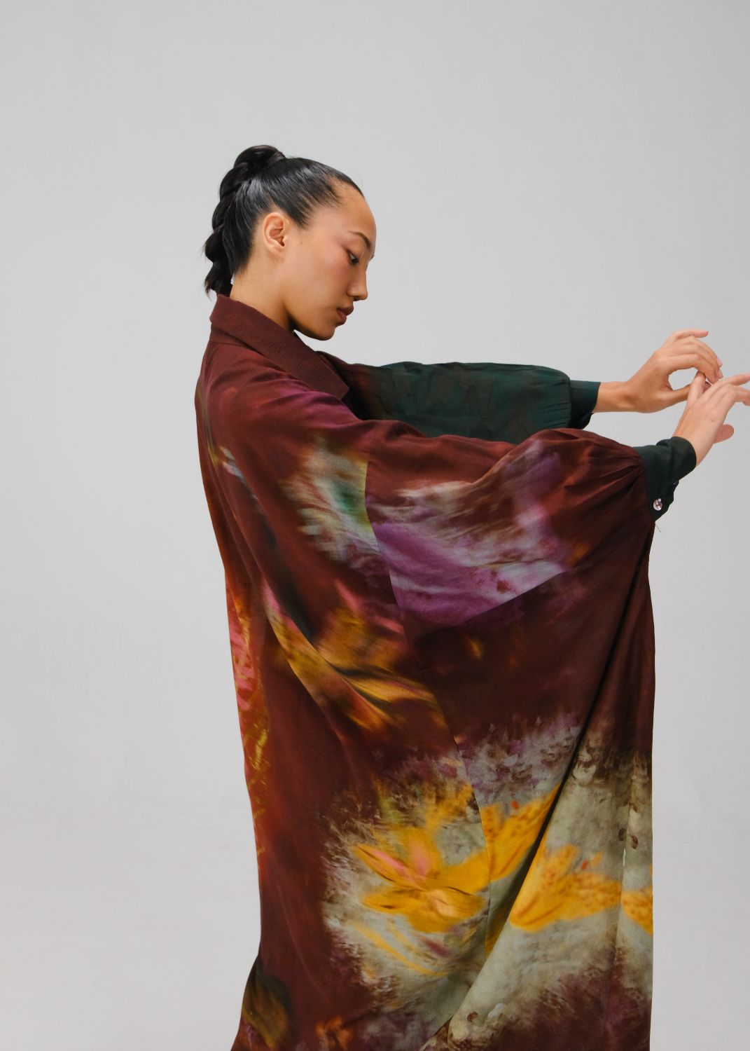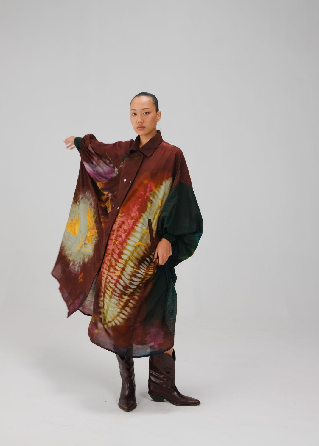 The Echo Dress is a free-size silhouette with dropped shoulders and signature batwing sleeves. The Echo Dress features gathered cuffs and pockets, offering effortless style with a relaxed, contemporary edge.