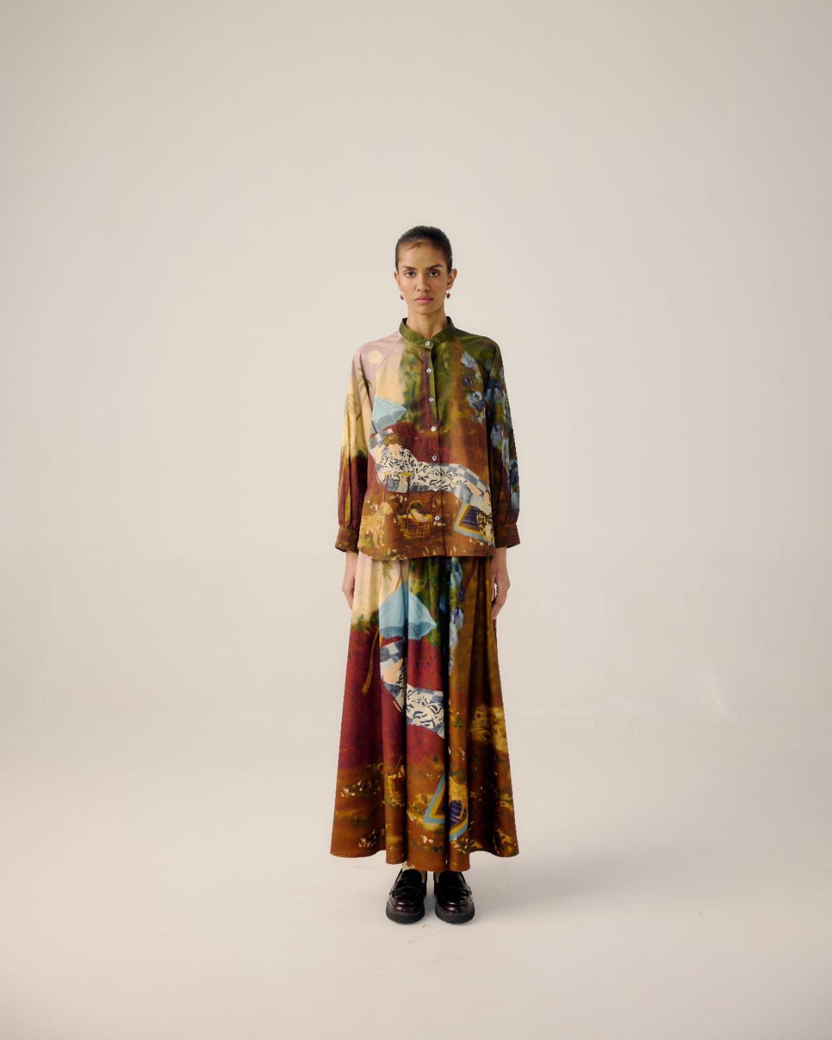 A-line shirt is the perfect easy going, care free silhouette. This shirt is made in pure cotton fabric, in our Lakeside print. This shirt features raglan sleeves with button down shirt detailing. It comes with a Circle skirt to complete the co ord look.