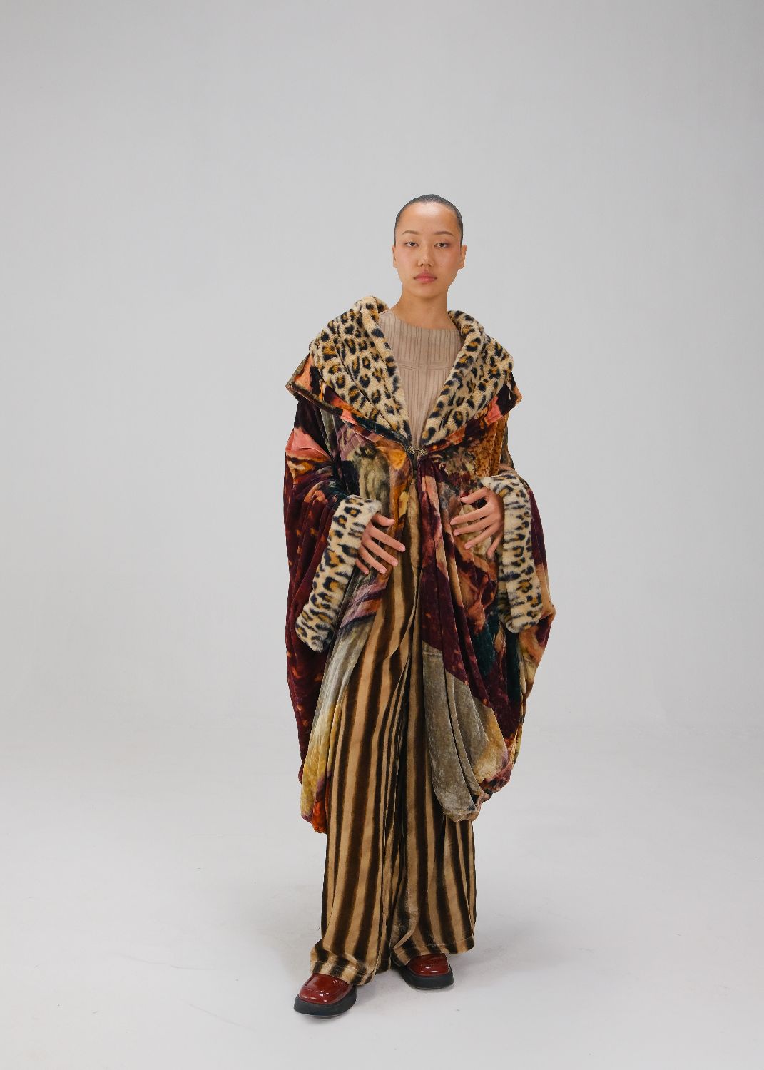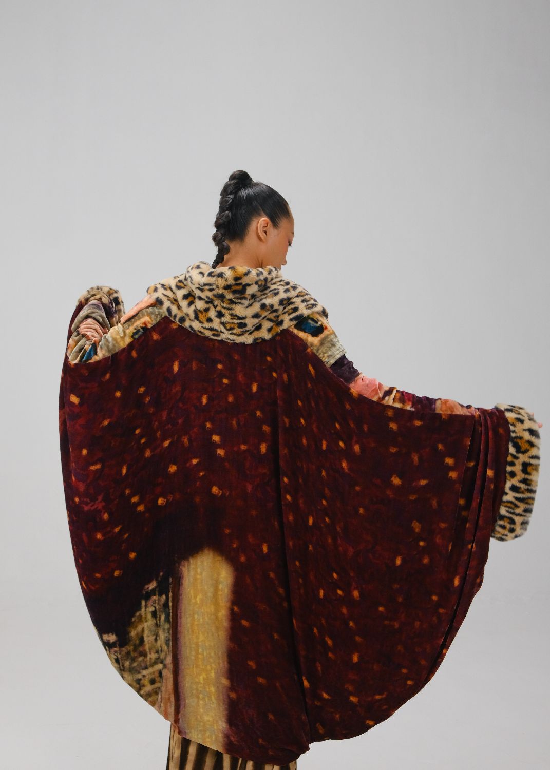The Fur Overlay is an exaggerated cover-up in our High-tea print, featuring leopard fur trims on the collar and cuffs. It has a super-relaxed silhouette with massive bat sleeves for added drama.