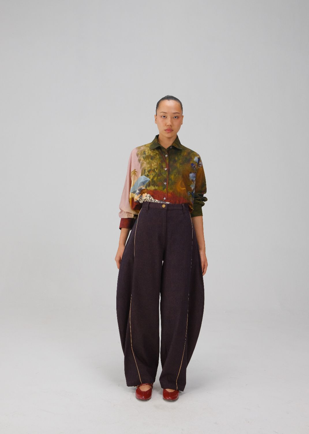The Keg pants are crafted with an exaggerated barrel silhouette, contrast piping along the front and back, a band waist, and front button fastening for structure and shape.