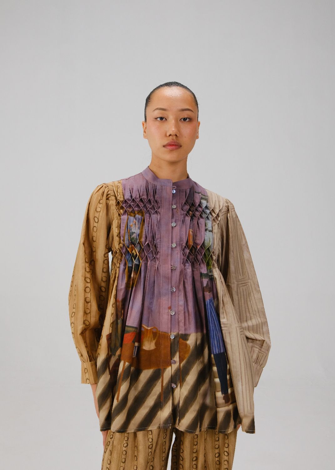 The Leni Top is a comfortable and stylish piece with a flowy silhouette. It features a classic button-up front and a band collar. The top is detailed with smocking on the yoke, and has full-length sleeves, creating a relaxed yet polished look