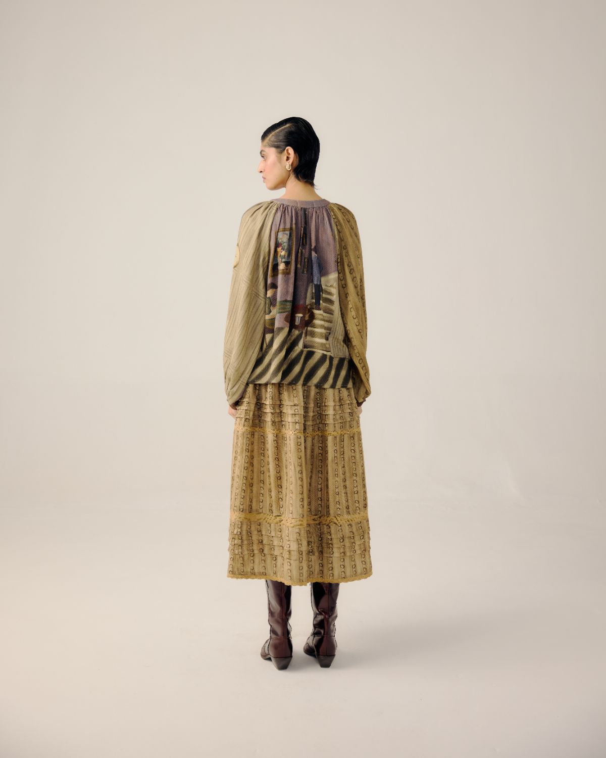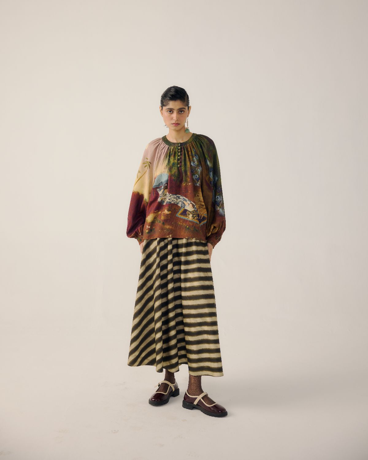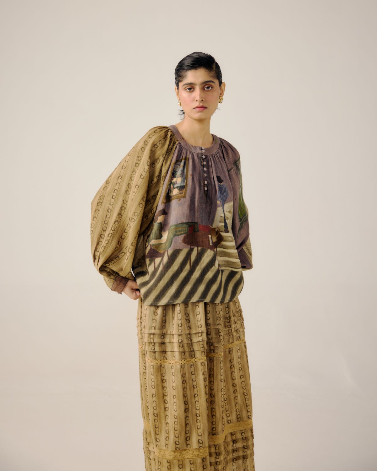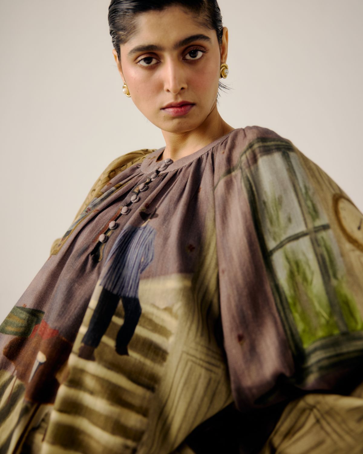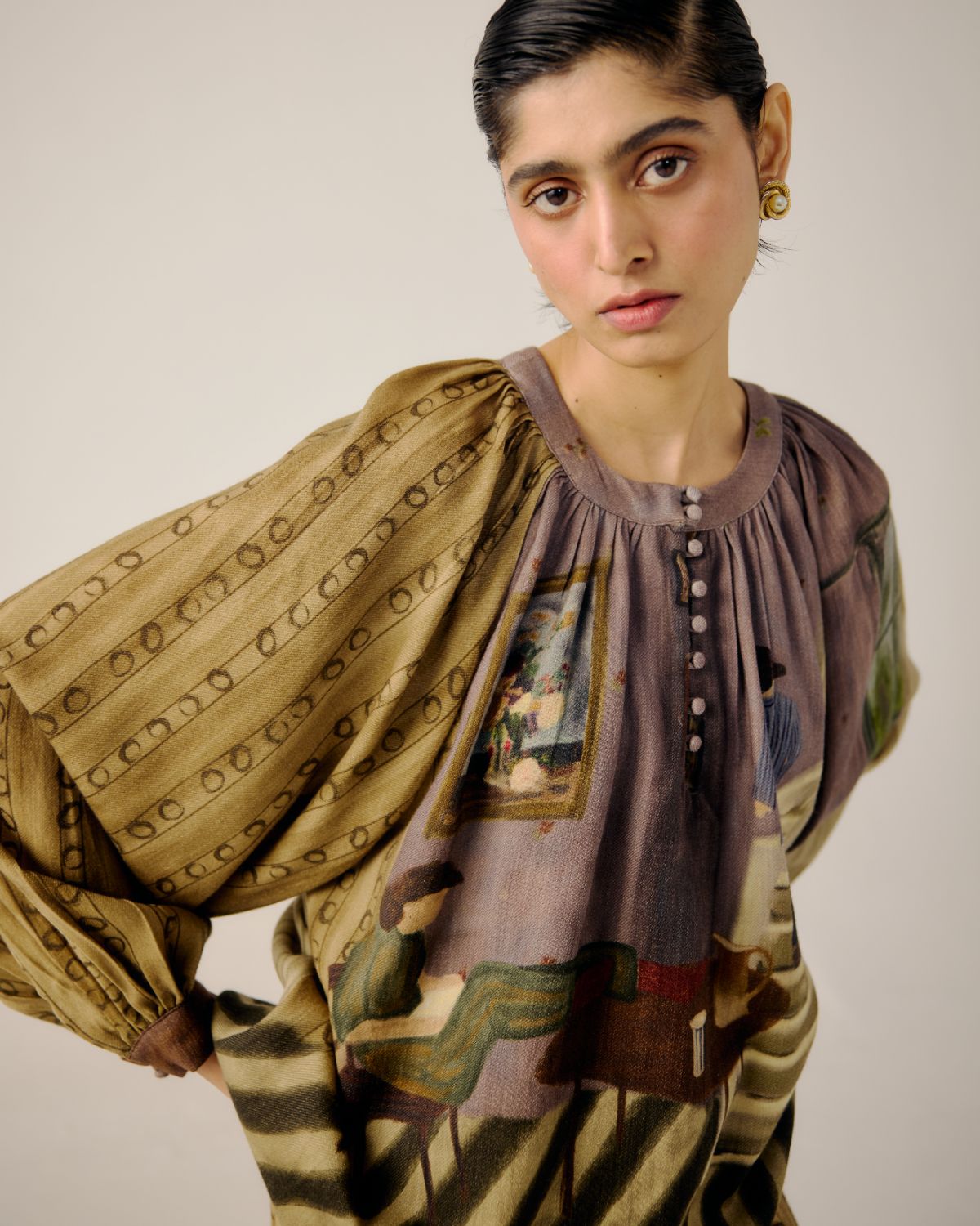 The Lido Top in Living Room Print, crafted from soft wool fabric, features a gathered neckline, bishop sleeves with cuffed ends, and a relaxed silhouette. With its vibrant colors and versatile design, it pairs effortlessly with skirts or pants for a chic, everyday look.